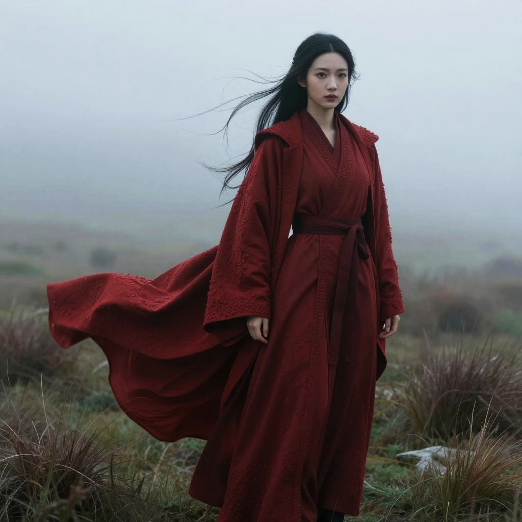 Crimson coat flowing in a gentle breeze, worn by a mysterious figure standing on a foggy moor, dramatic lighting, cinematic atmosphere, detailed texture, fantasy style