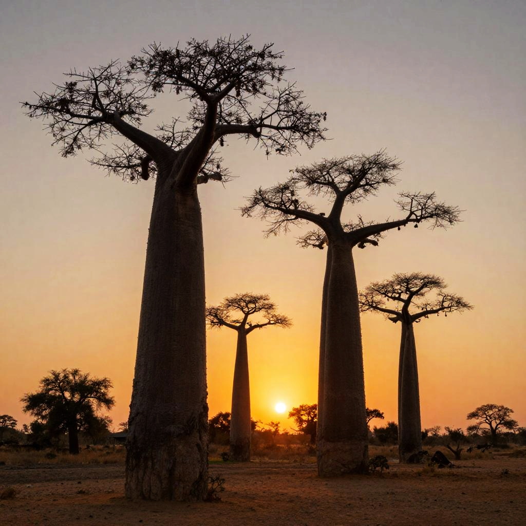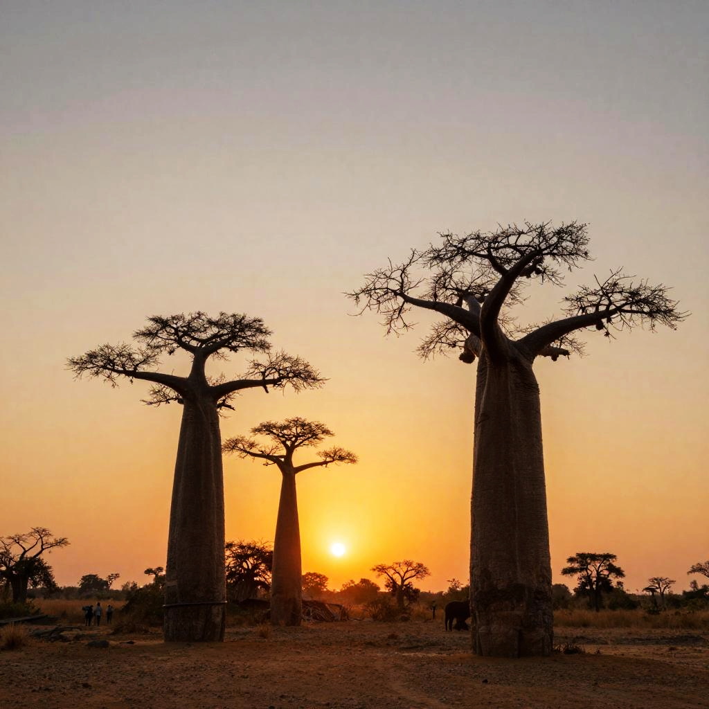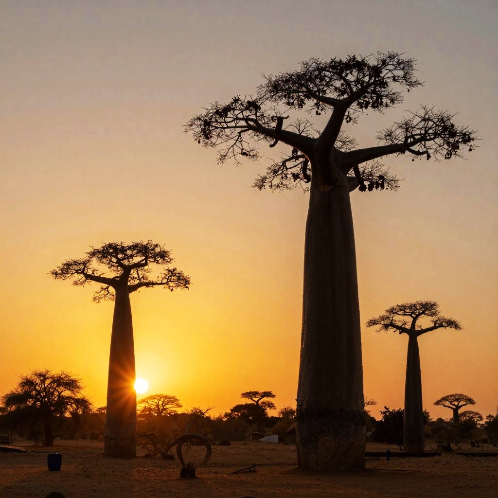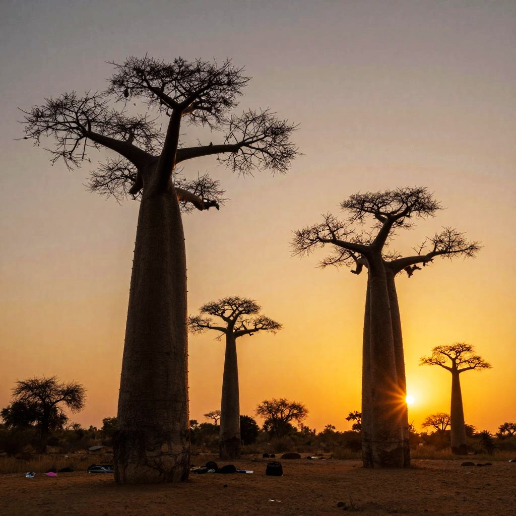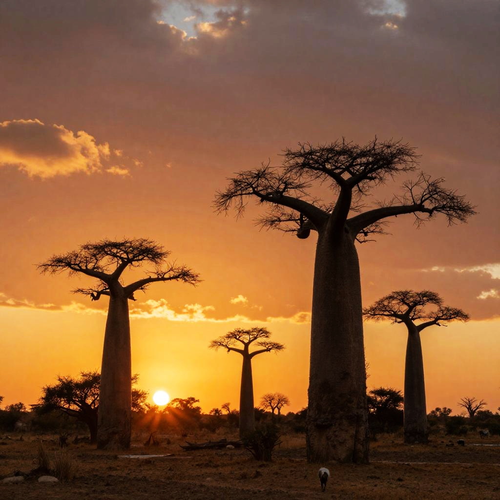 Photograph of silhouetted baobab trees against a vibrant orange sunset in an African savanna, with sparse acacia trees in the background
