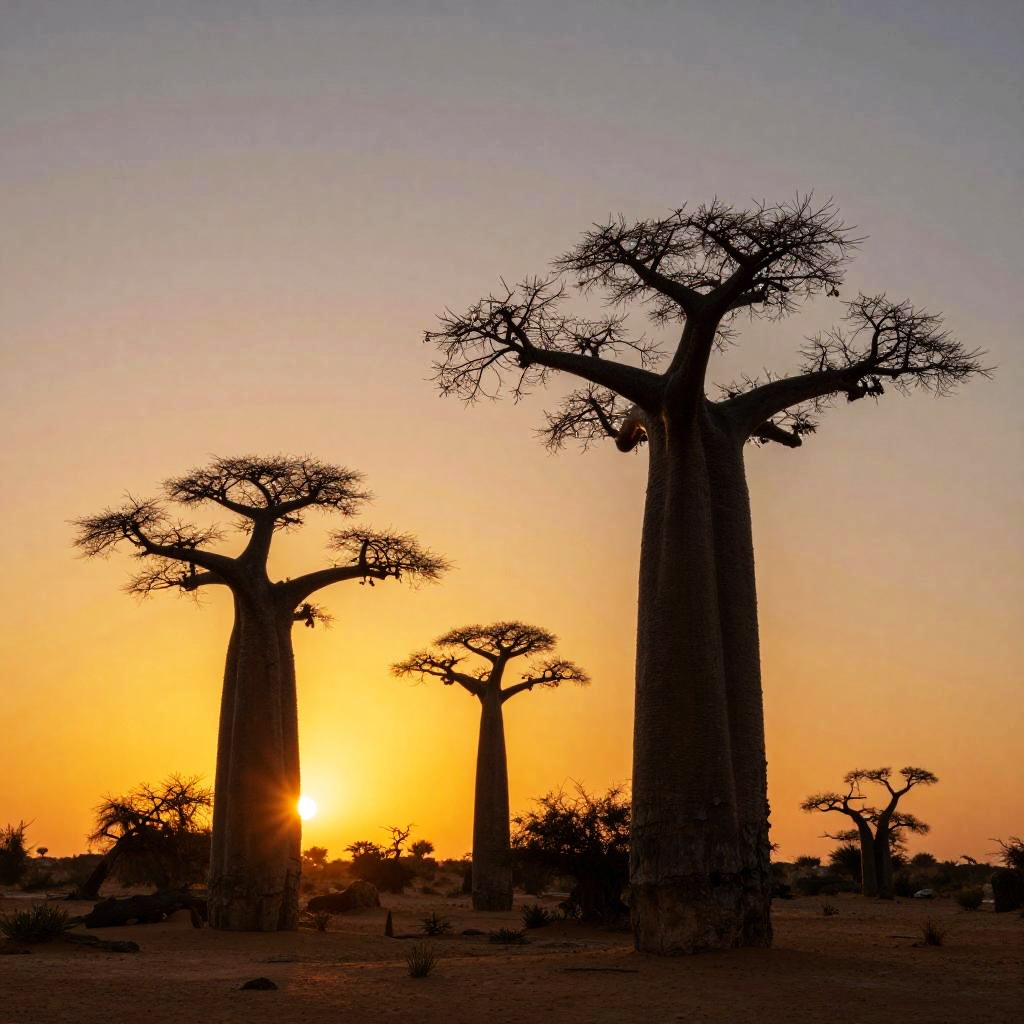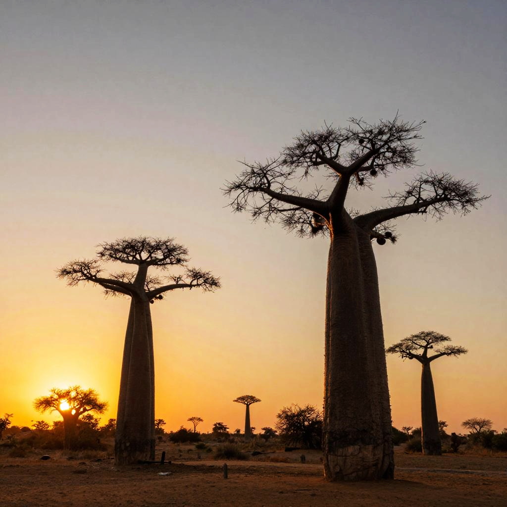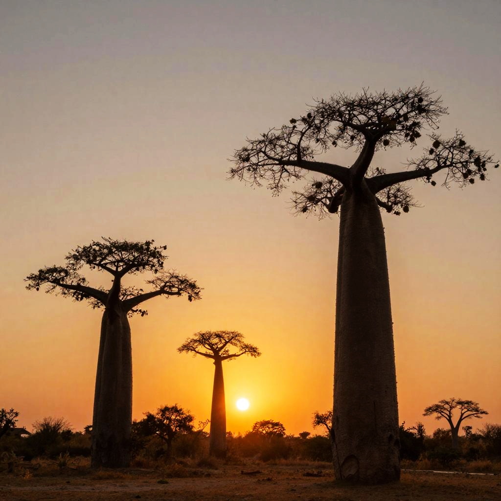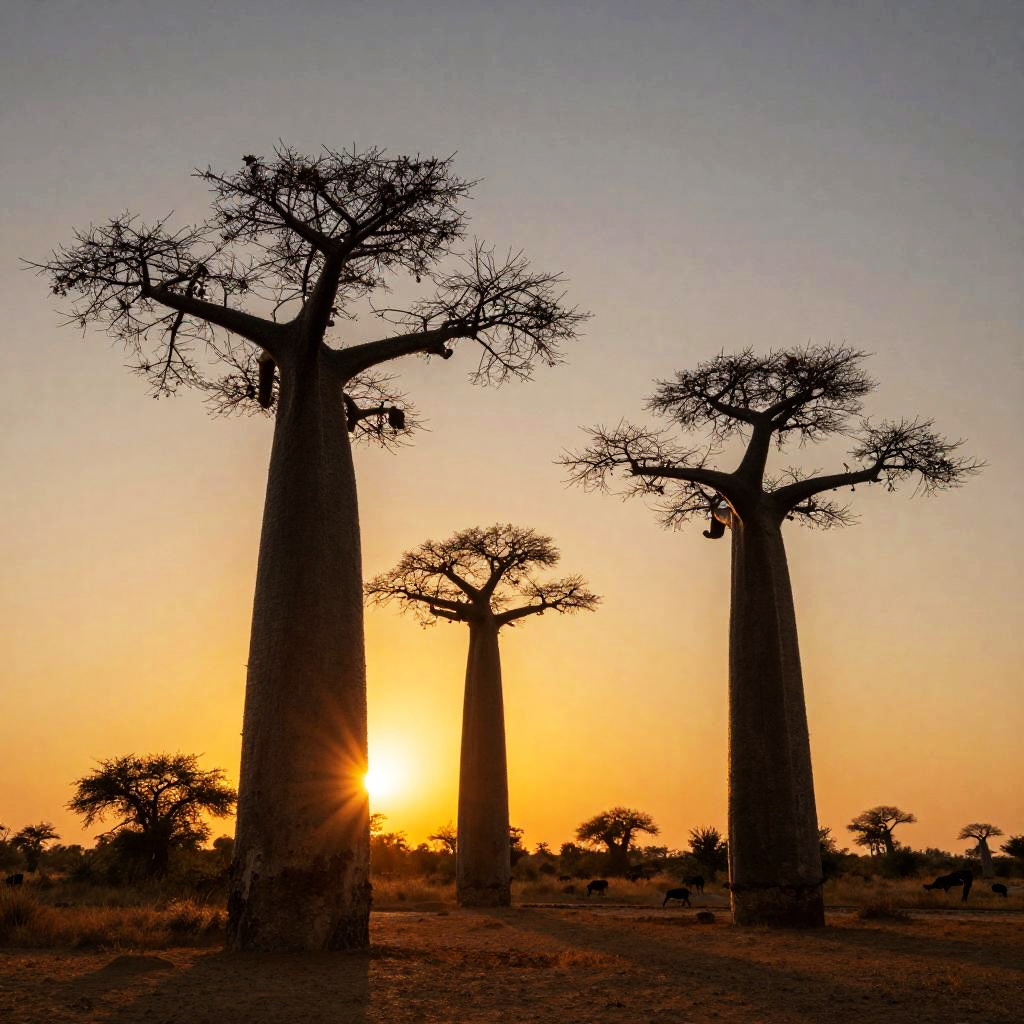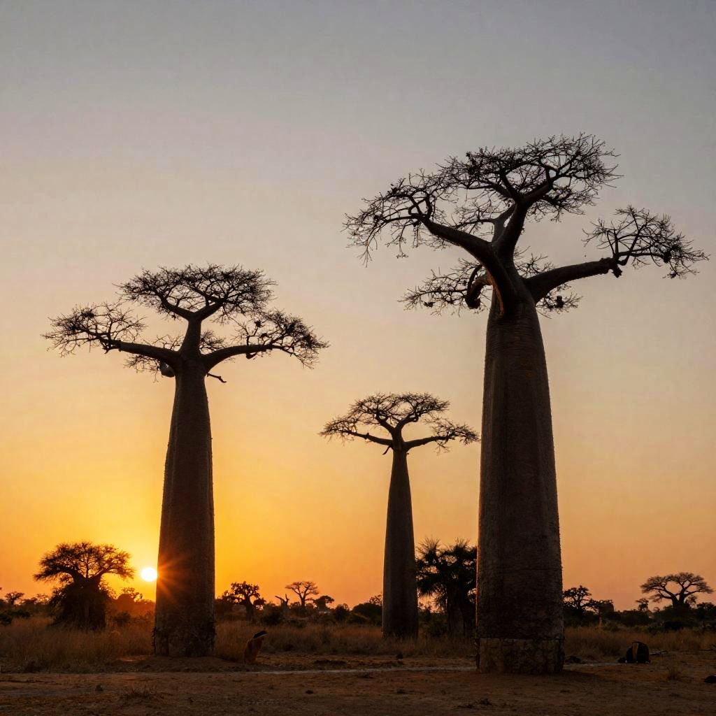 Photograph of silhouetted baobab trees against a vibrant orange sunset in an African savanna, with sparse acacia trees in the background