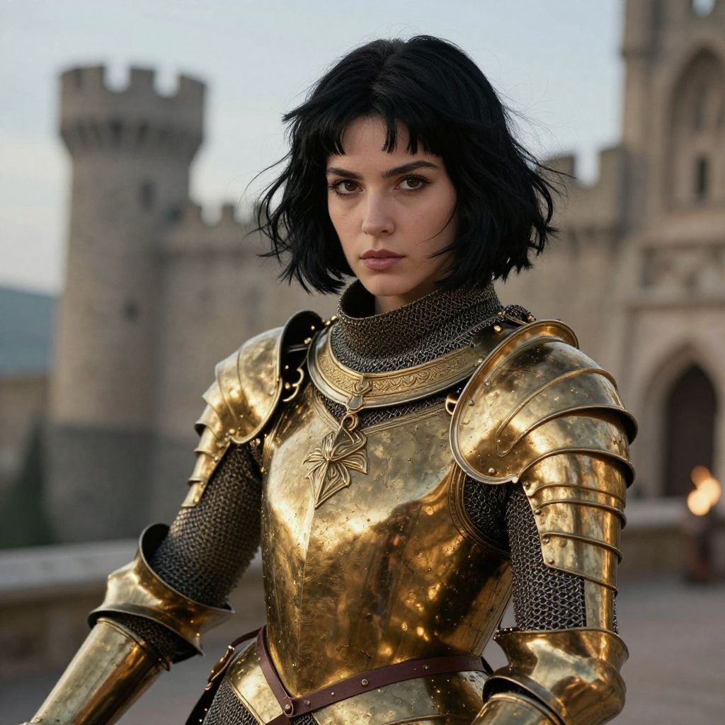 (masterpiece, best quality, highres:1.2), (intricate and beautiful:1.2), (detailed light:1.2), (colorful, dynamic angle), Portrait of a girl, the most beautiful in the world, (medieval gold armor), metal gold reflections, upper body, outdoors, intense light, far away castle, professional photograph of a stunning woman detailed, perfect bobbed sexy intense black hair, sharp focus, dramatic, award winning, cinematic lighting, volumetrics dtx, (film grain, blurry background, blurry foreground, depth of field, interaction, Perfect chainmail), (cinematic)
