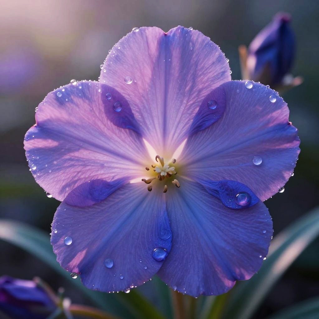 Erster bloom of a rare exotic flower in a mystical garden at dawn, rich saturated colors blending purples, pinks, and blues, surrounded by dewdrops and gentle morning light, highly detailed petals with delicate textures, magical and serene environment.