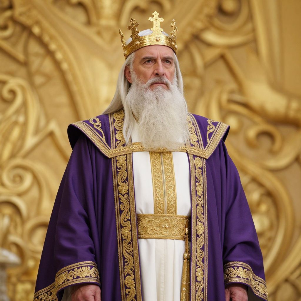 Photograph of an older man with a long white beard and mustache, wearing a golden crown, purple and white robes with intricate gold embroidery, and a matching gold belt. He stands against a blurred, golden, ornate background, looking serious and regal. His robes are luxurious and flowy, contrasting with the smooth, golden backdrop behind him.