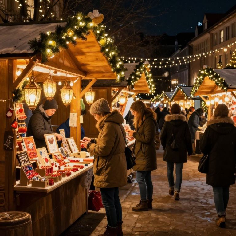 Photograph of a festive, nighttime Christmas market with warmly lit wooden stalls, string lights, and shoppers in winter coats browsing holiday decorations and gifts.
