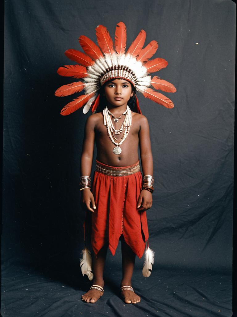 Red indian costume boy, solo, 1boy, male focus, jewelry, headdress, standing, full body, dark skin, arms at sides, bracelet, necklace, looking at viewer, barefoot, child, feathers