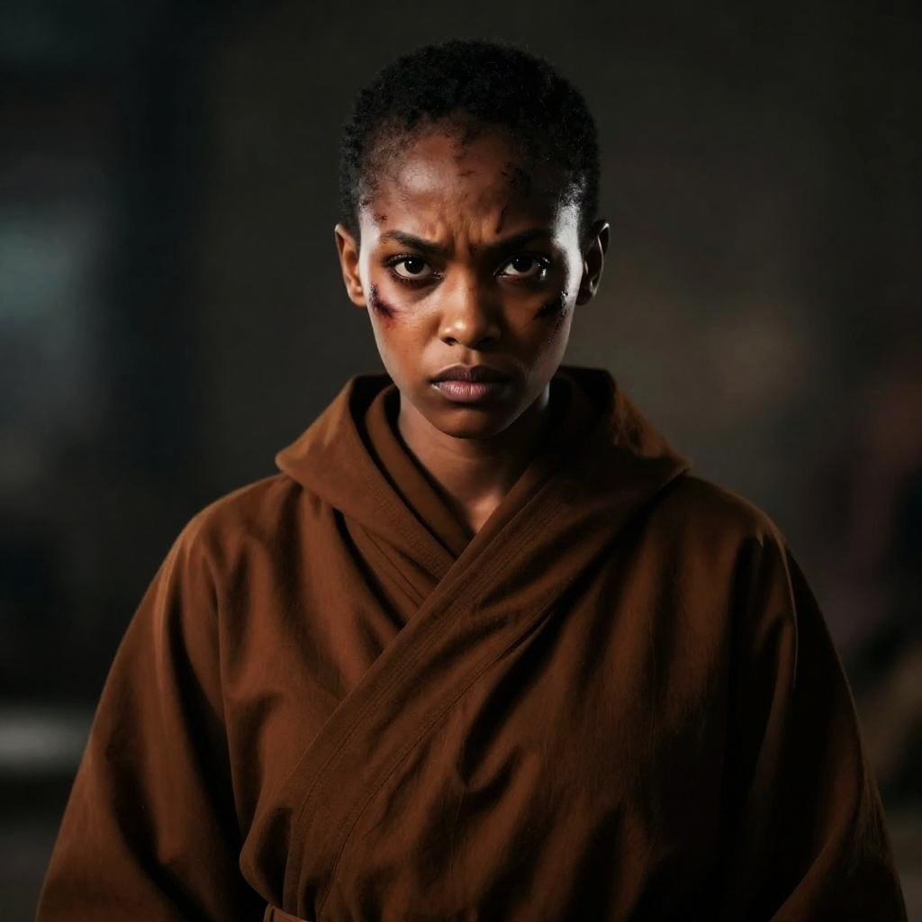 Close-up portrait of a young African woman wearing a brown monk's robe, showing intense eyes and an angry expression. Her face displays multiple battle scars, and the image features high contrast and dramatic lighting with a blurred background, creating a cinematic and ultra-realistic effect.