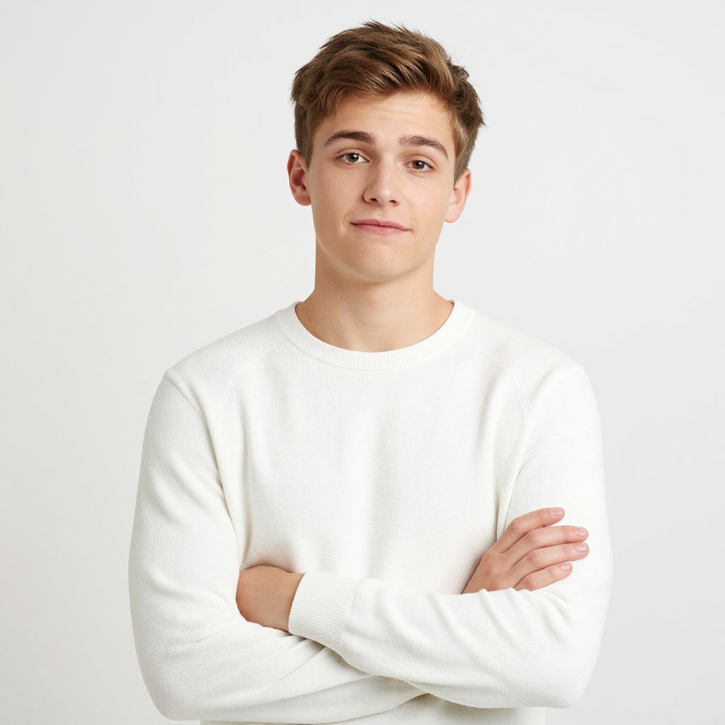 Photograph of a young Caucasian man with light skin and short, brown hair, styled slightly to the side. He has a neutral expression, with light brown eyes and faint eyebrows. He is wearing a plain white, long-sleeve sweater and has his arms crossed over his chest. The background is entirely white, creating a clean, minimalist look. The lighting is even, highlighting his smooth skin and the texture of his sweater. His overall appearance is casual and approachable.