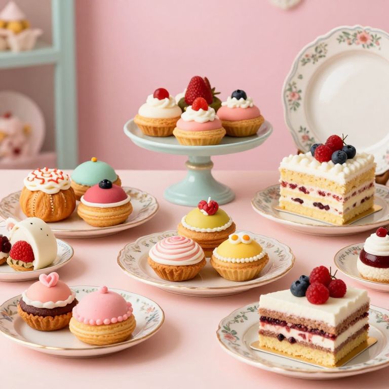 Postres in a whimsical dessert shop display, featuring an assortment of colorful pastries, layered cakes, and traditional sweets, with intricate icing decorations and fresh berries, surrounded by vintage ceramic plates and pastel backgrounds for a charming atmosphere.