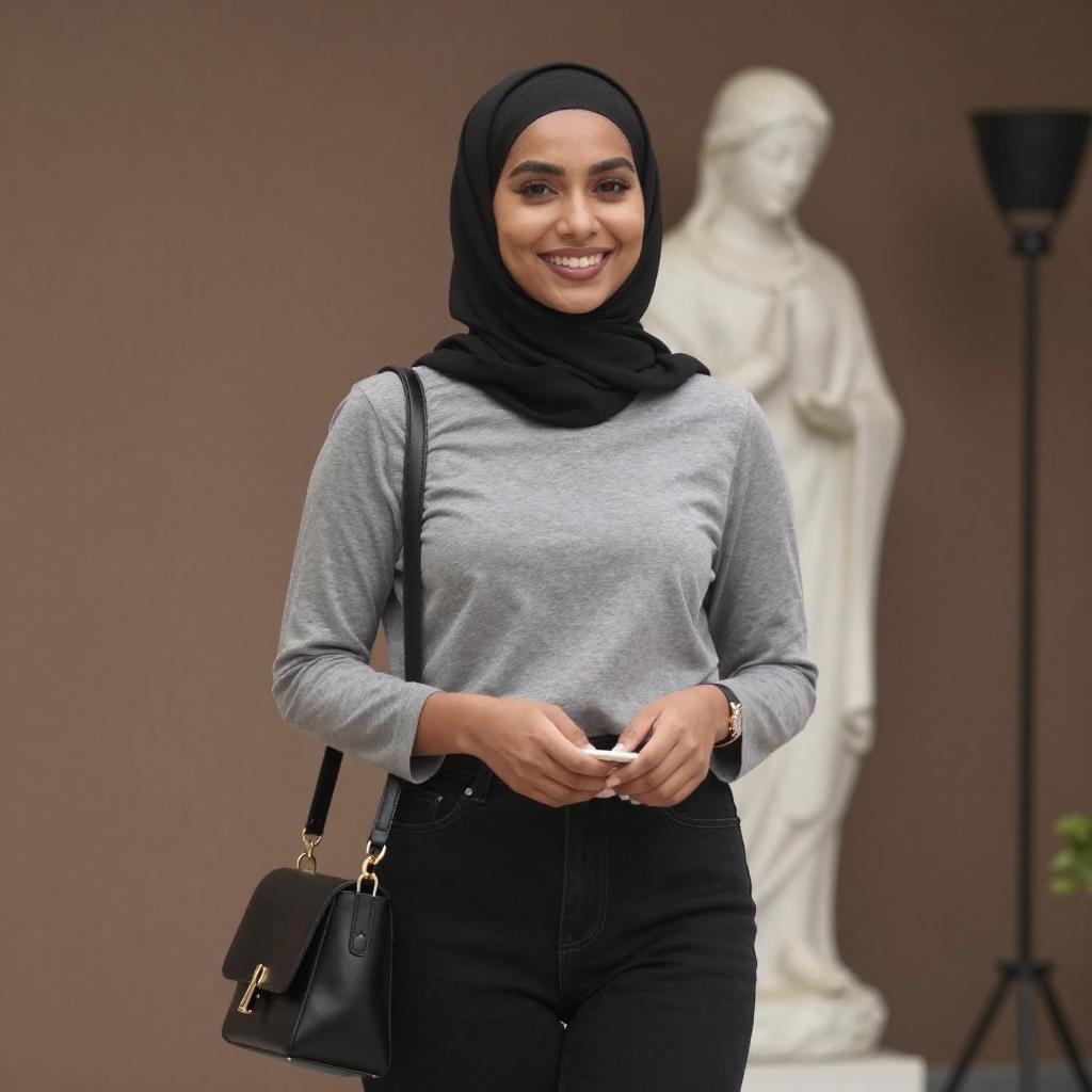 Photograph of a young woman with light skin and dark hair, wearing a black hijab, black long-sleeve top, and high-waisted blue jeans. She carries a beige shoulder bag and walks with a slight smile, her right hand resting on a dark, glossy surface. The background features dark gray tiled walls and bright, reflective lights.