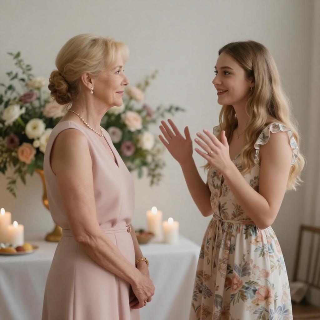 An older blonde woman in a sleeveless pale pink dress with pearl jewelry stands facing a younger blonde woman in a floral sleeveless dress. They are engaged in a conversation indoors, in front of a table adorned with a large floral arrangement and lit candles, creating a warm, elegant ambiance.