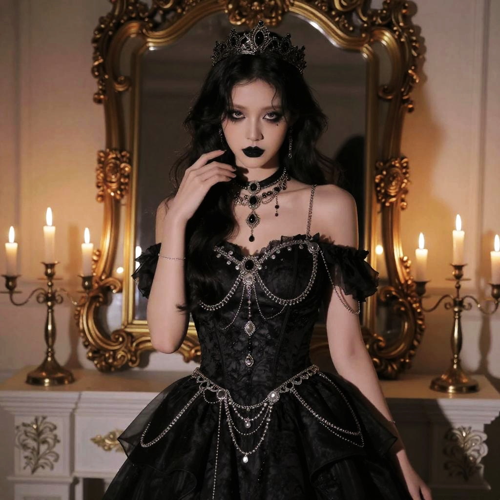 Angela White goth aesthetic, sitting in a vintage Victorian room decorated with dark velvet drapes and antique candelabras, wearing a corseted black dress with lace gloves, smoky eye makeup, platinum blonde hair styled in loose waves, mysterious vibe