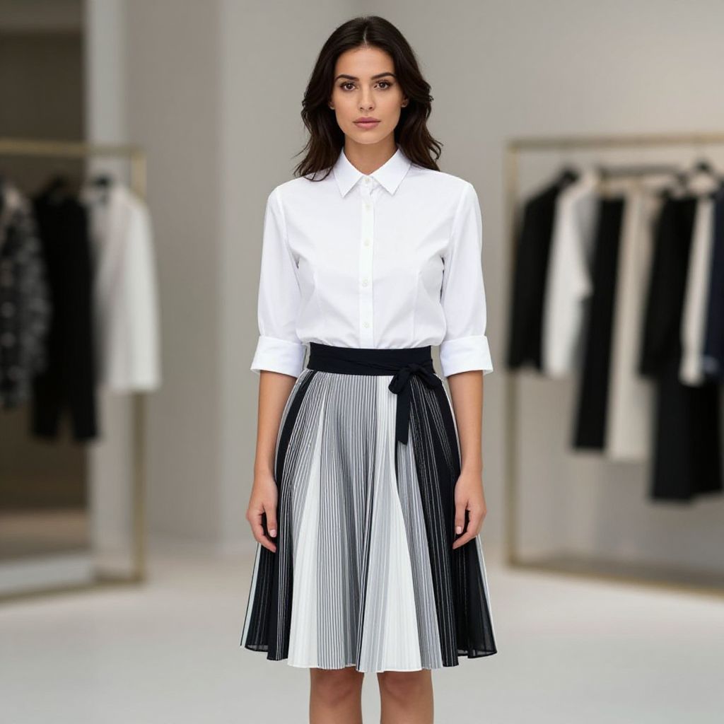Photograph of a young woman with long, dark brown hair, standing in a minimalistic, white-walled room. She wears a white, short-sleeved blouse with a pointed collar and a high-waisted, knee-length skirt featuring vertical black and white stripes with black pleats. Her expression is neutral, and she stands directly facing the camera. In the blurred background, there are two clothing racks displaying black and white garments. The overall style is modern and chic, with a focus on monochromatic contrasts and clean lines. The lighting is bright and even, emphasizing the simplicity and elegance of the outfit.