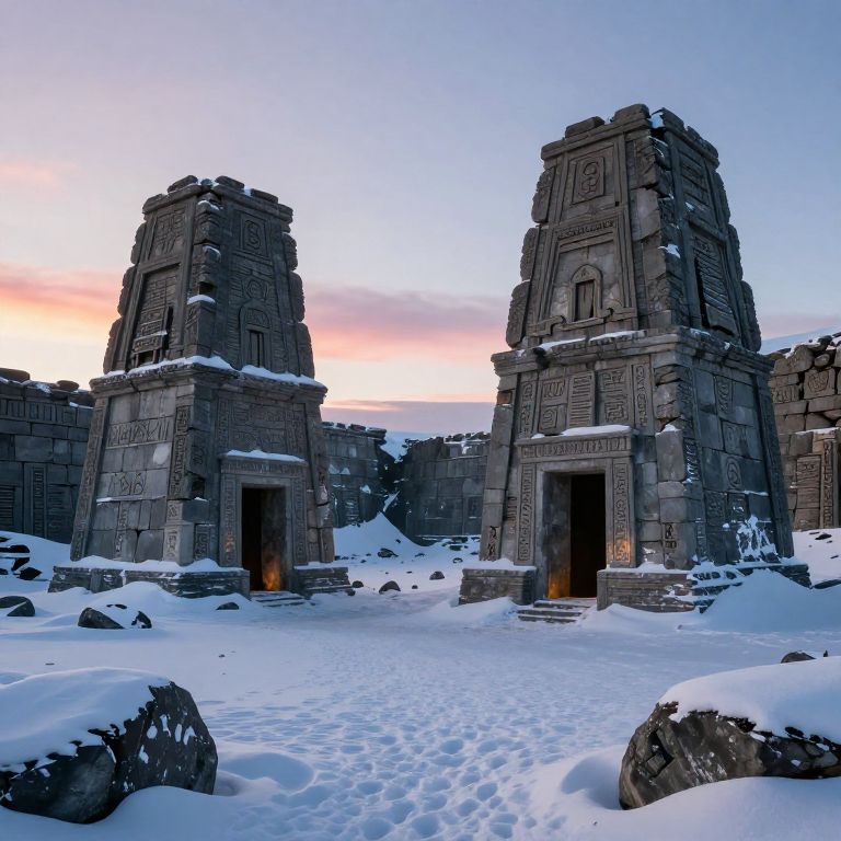 Ancient ruins in Antarctica featuring vast, weathered stone temples emerging from snowdrifts, ancient carvings visible on walls, illuminated by soft polar sunset, mystical and surreal