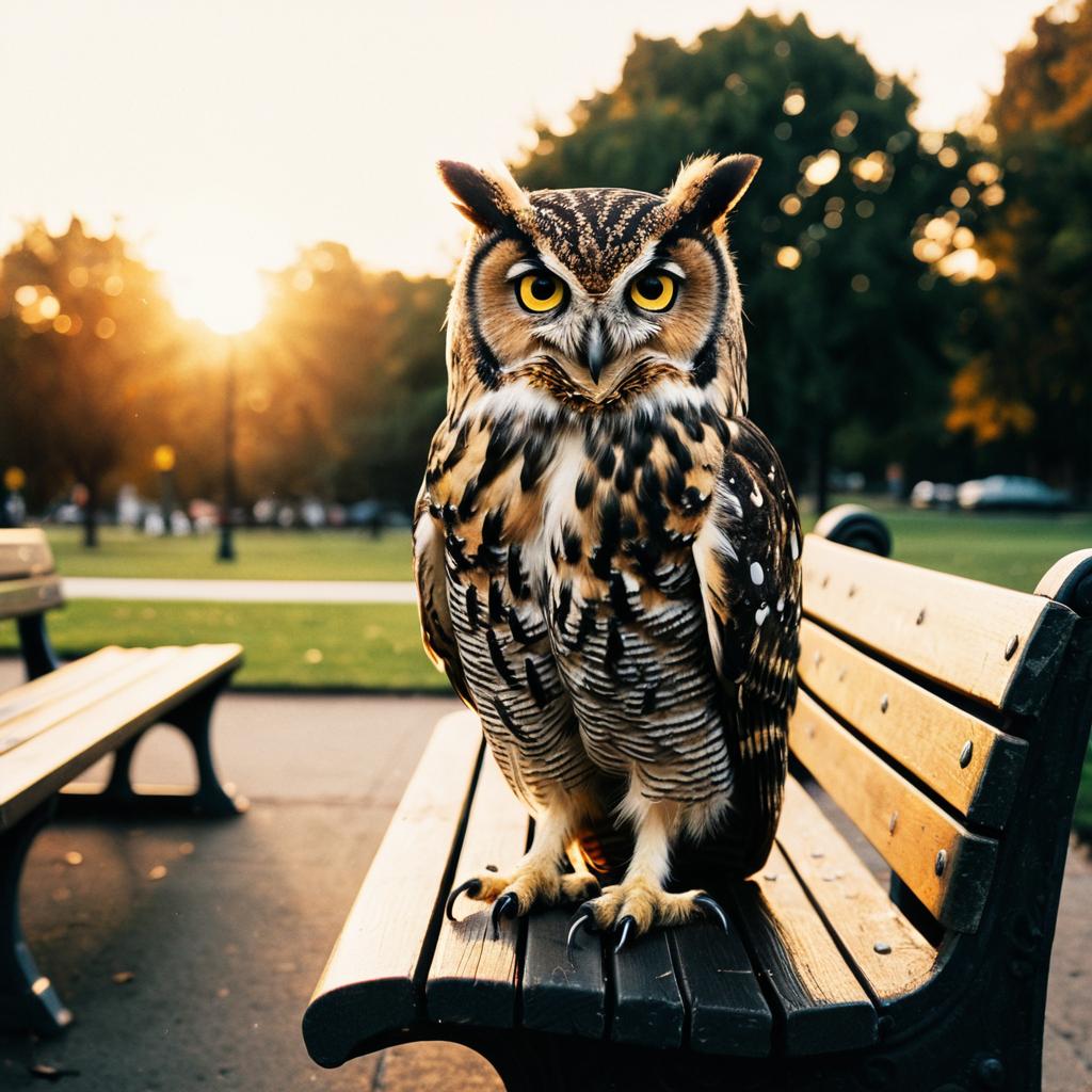 A close-up of a wise-looking owl perched on a wooden park bench during sunset. The owl's bright yellow eyes stare intensely forward, with its detailed brown and white feathers illuminated by the warm evening light. The background shows a grassy park area with trees and a glowing sun low on the horizon.