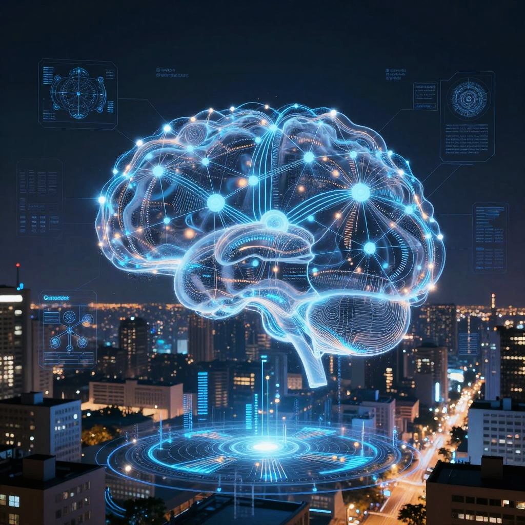 Open AI photo of a glowing AI interface projected from a smartwatch on a person's wrist, displaying complex algorithms and 3D neural network visualization, modern urban background, vivid color palette, and sharp focus.
