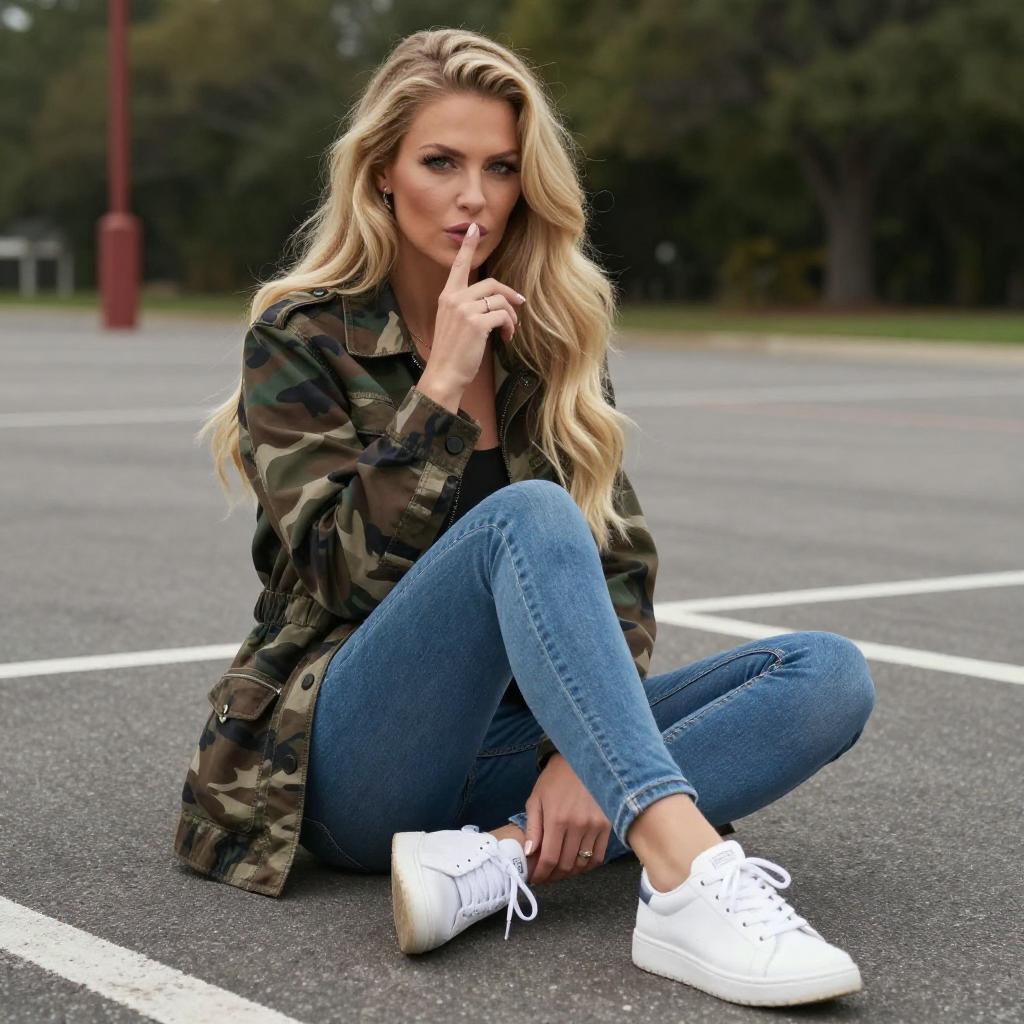 Photograph of a blonde woman with long hair, sitting on an asphalt parking lot. She wears a camouflage jacket, tight blue jeans, and white sneakers. She is looking at the camera with her finger on her lips, sitting with one knee up and the other leg bent. Background includes green trees and a red pole.
