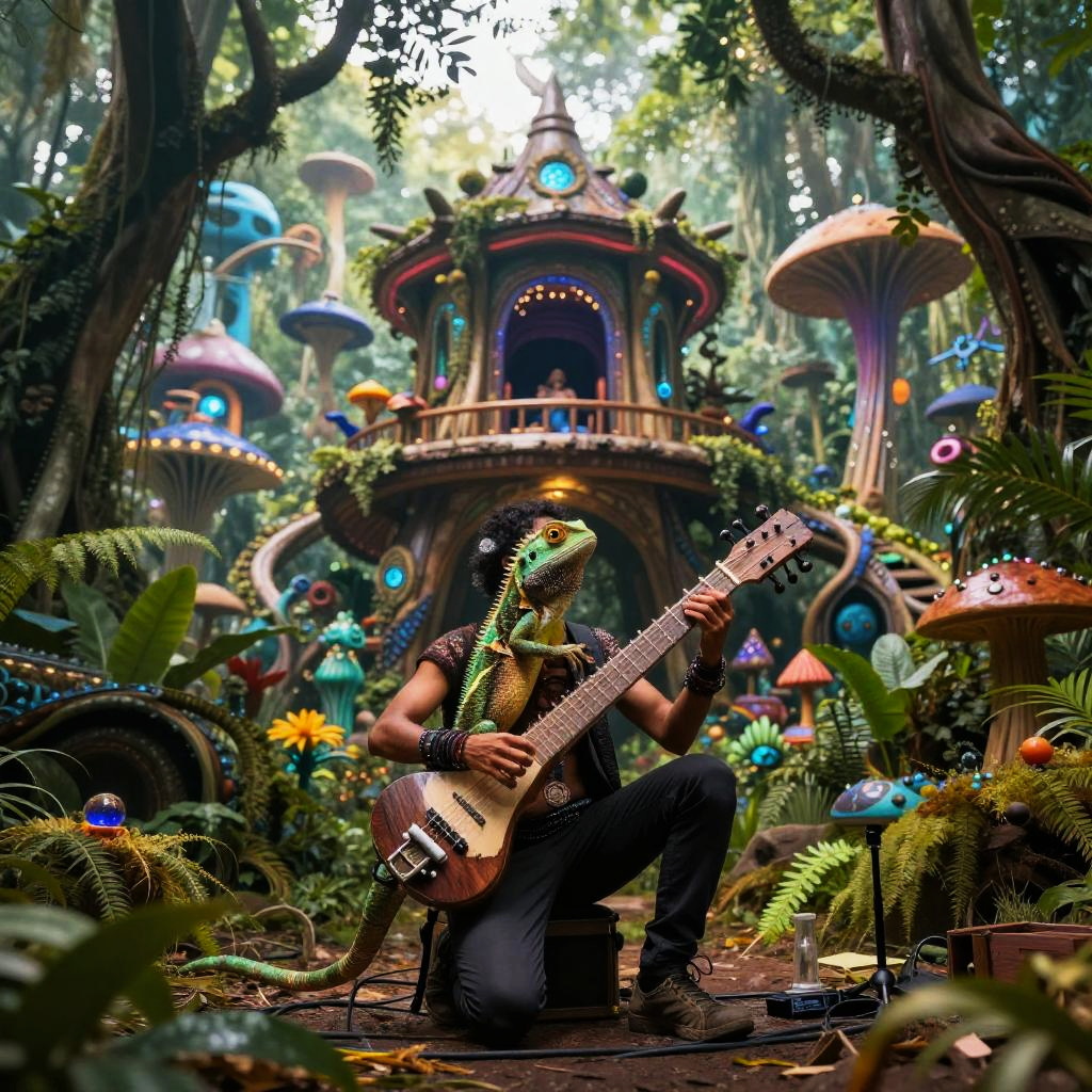 Hyper-realistic photo of a green lizard playing a sitar while kneeling in a vibrant, futuristic forest setting during the Woodlight Festival band contest. The scene features colorful, oversized mushrooms and a whimsical, exotic resort structure in the background, with lush greenery and whimsical flora surrounding the subject. The atmosphere is strange and vivid, resembling a National Geographic style photograph.