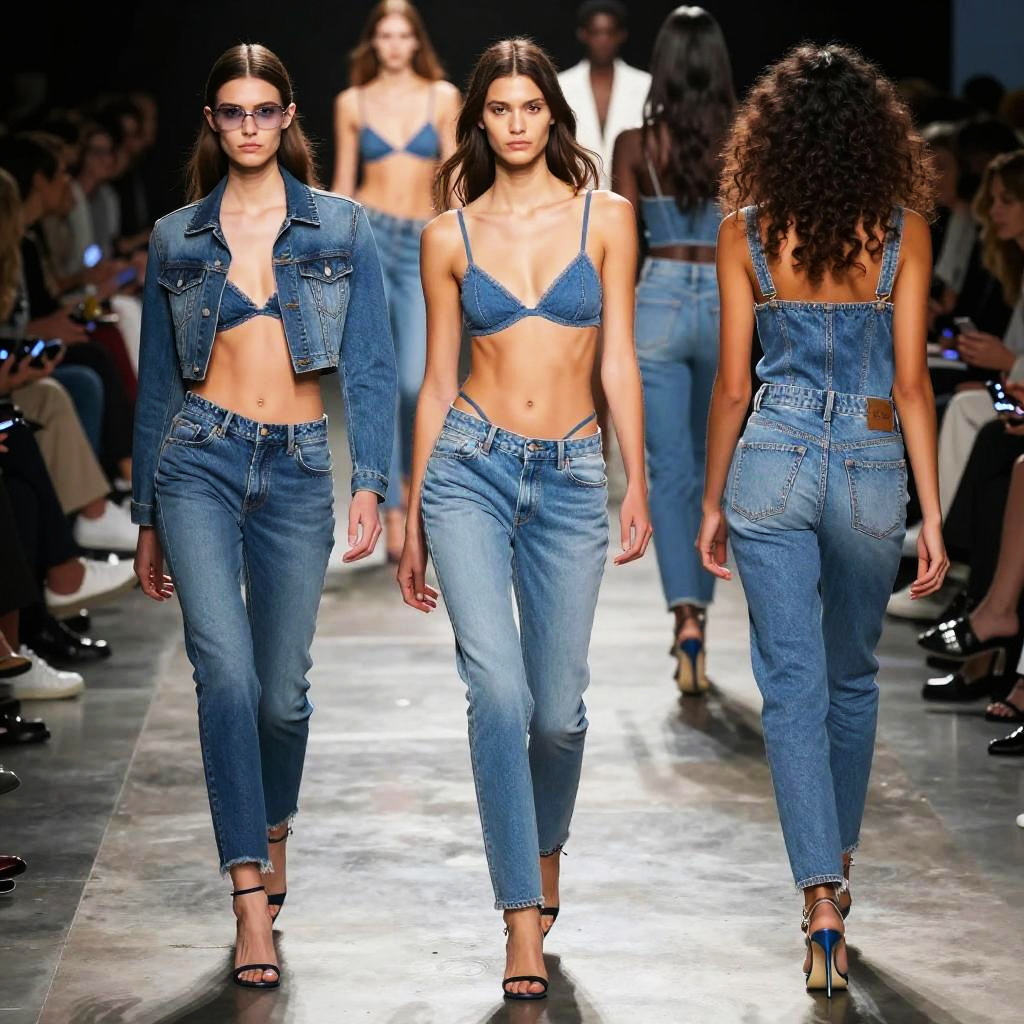 G string jeans on runway, diverse models walking, bold denim with g string accents, high fashion catwalk setting, dramatic lighting, vibrant colors, editorial style photography