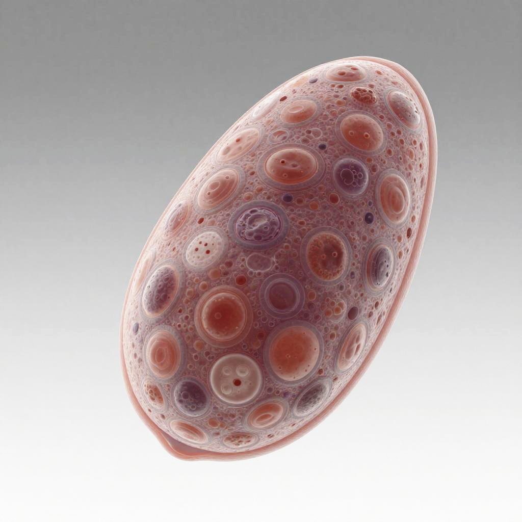 High-resolution digital render of bird testicles isolated against a gradient backdrop, focusing on cell structures and tissue, with a translucent effect showcasing depth and complexity, perfect for biological visualization and study.