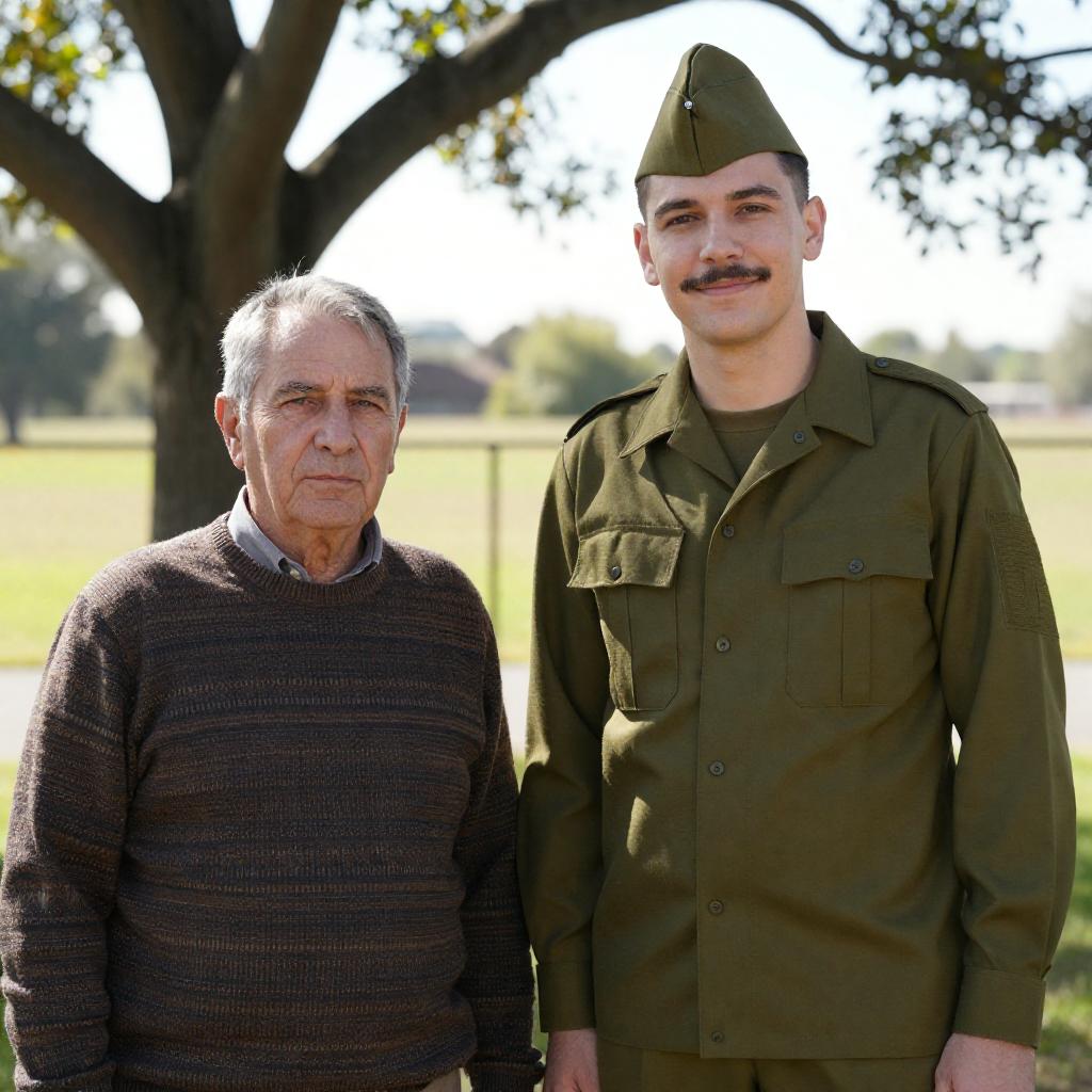 Black and white photograph of two men outdoors. Older man with short gray hair, stern expression, in a pinstripe suit and tie, stands left. Younger man with mustache, smiling, wearing military-style hat and jacket, stands right. Hills in background.