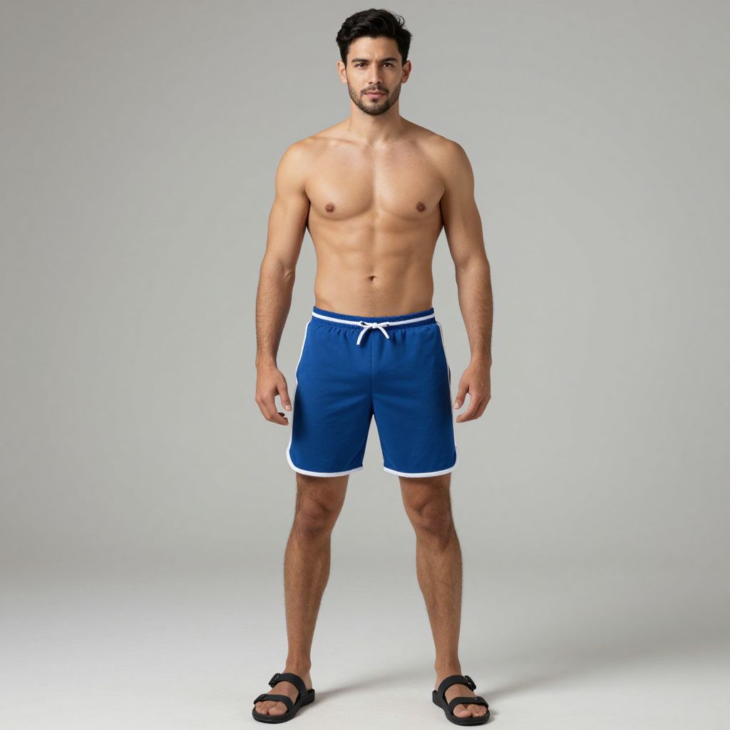 Man sweat shorts costume, 1boy, male focus, solo, topless male, facial hair, realistic, shorts, standing, full body, black hair, sandals, muscular, navel