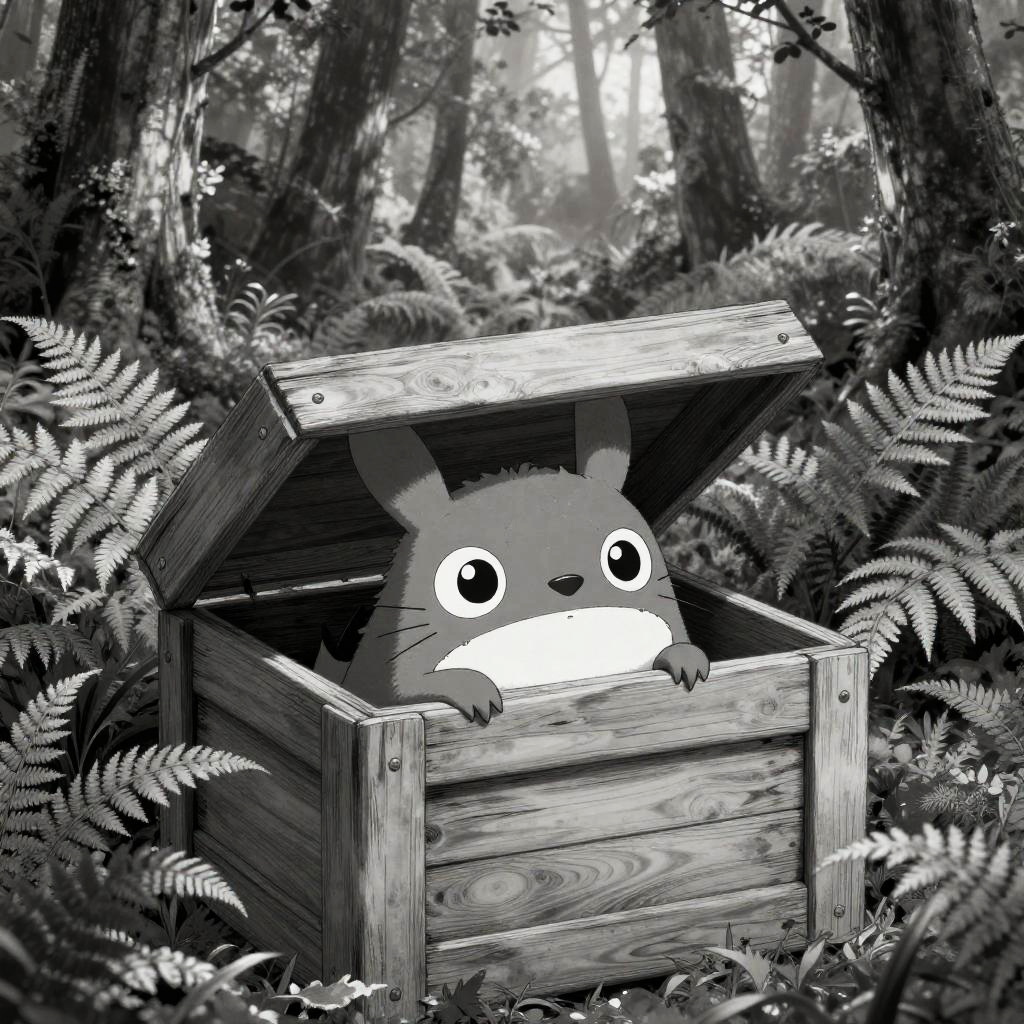 A black-and-white digital drawing features a cute, cartoonish creature with large, pointed ears and wide, expressive eyes peeking out of a wooden crate in the center. The crate is open, with its lid tilted upwards. Surrounding the crate are dense, detailed ferns and tall, thin trees in the background, creating a forest setting. The image has a high-contrast, manga-style aesthetic.