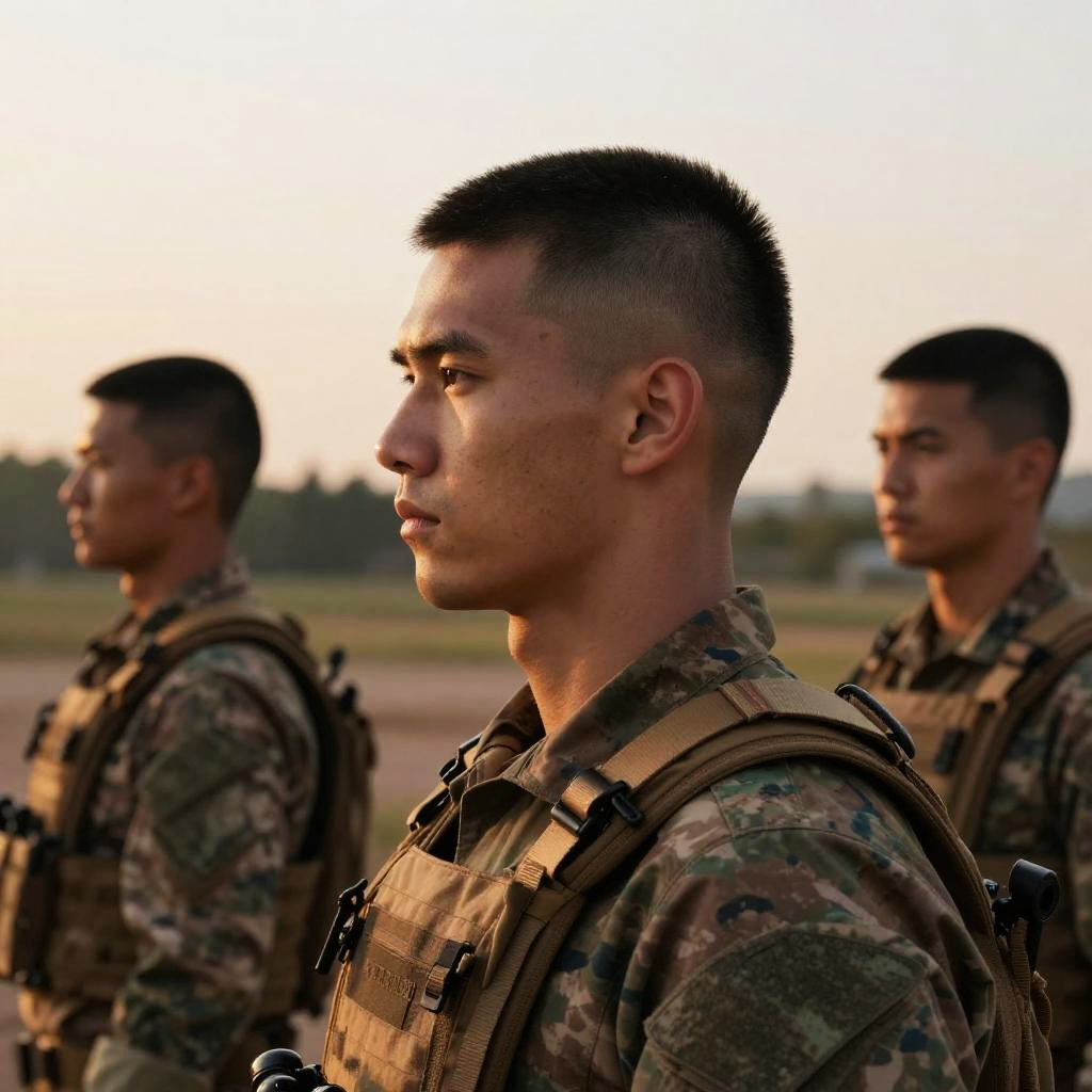 Military style haircuts, soldiers in combat gear with buzz cuts and high and tight cuts, rugged outdoor background, sunset lighting, cinematic atmosphere