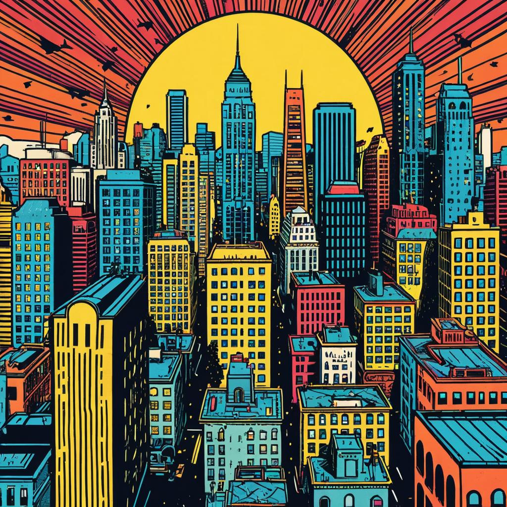 Illustration of a vibrant city skyline, kid-friendly, bold colors, playful silhouettes, comic book style, educational, detailed landmarks