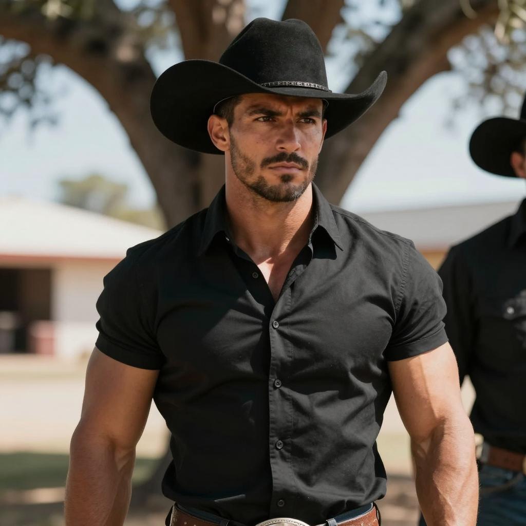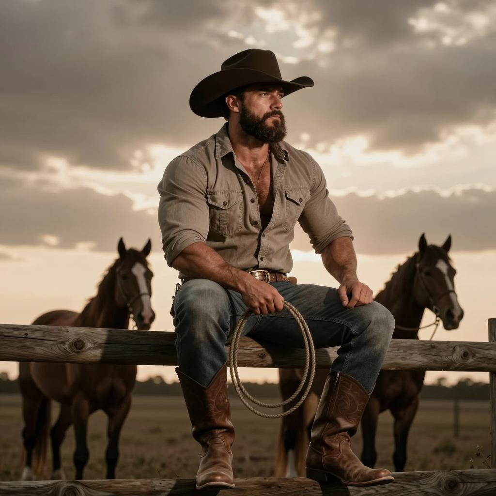 Photograph of a muscular, bearded man with a strong jawline, wearing an open shirt, cowboy hat, and boots, sitting on a wooden fence holding a lasso. He has a serious expression and is looking to the side. The background shows two horses in silhouette against a dramatic, cloudy sunset. The lighting is warm and low, creating a sepia tone. The camera angle is slightly low, emphasizing his presence. The depth of field is shallow, with the background blurred.