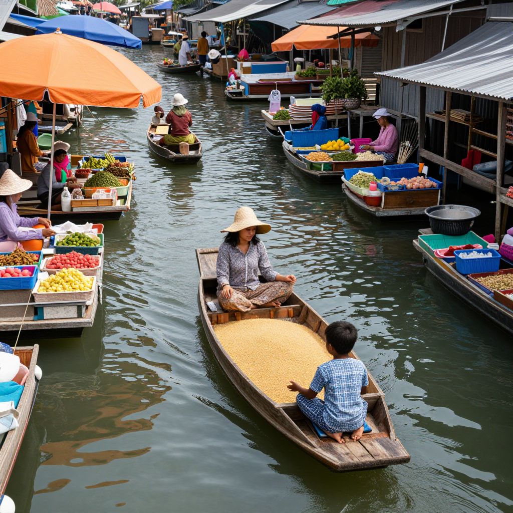 A serene waterway teems with life as a woman and child navigate a small wooden boat laden with golden grains, surrounded by vibrant floating markets where vendors display colorful produce and traditional wares beneath orange awnings, while others paddle through the calm waters, creating a tapestry of cultural exchange and daily commerce.