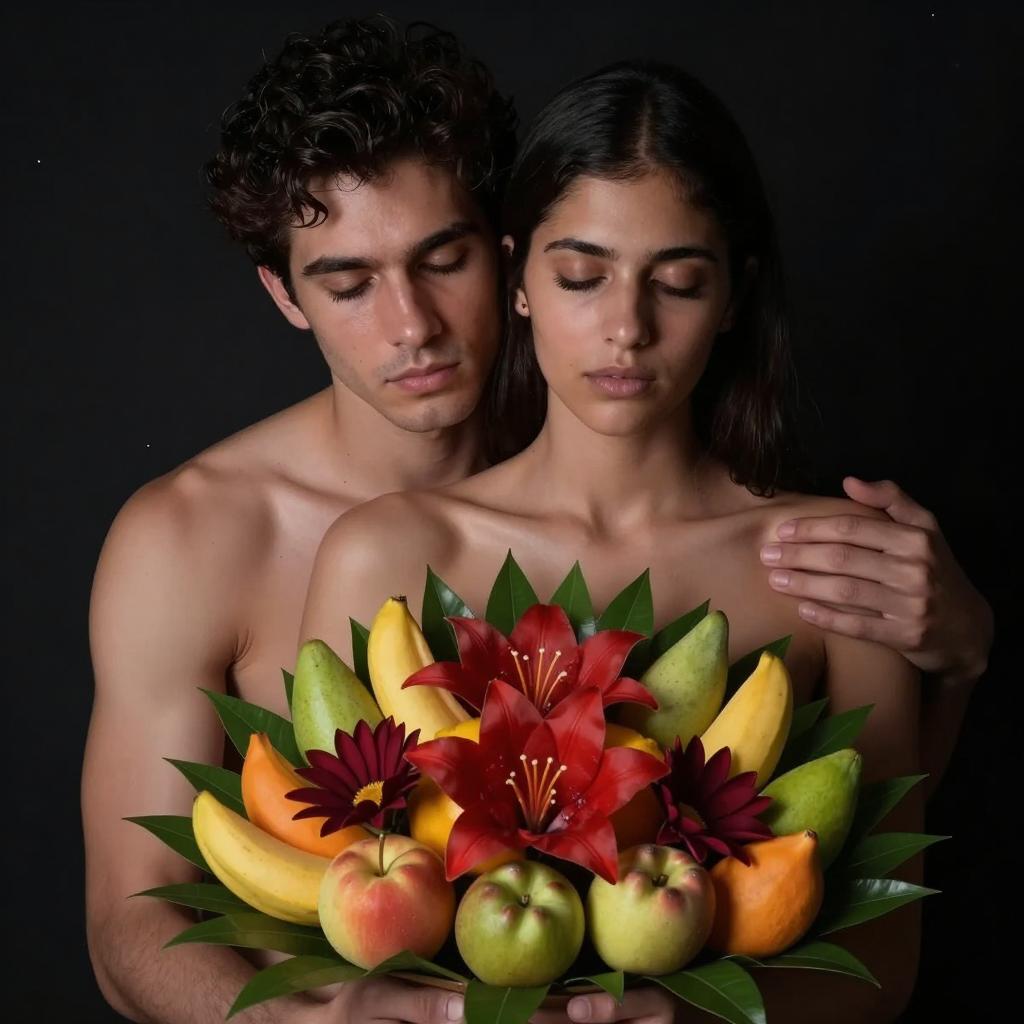 Two people with dark hair in dim lighting. Man on left, woman on right, both with serious expressions. Both shirtless, woman's right arm around man's neck. Both eyes closed. Central foreground: colorful fruit arrangement with red flowers and green leaves. Dark background with small, faint white stars. Man's left hand holds fruit arrangement.