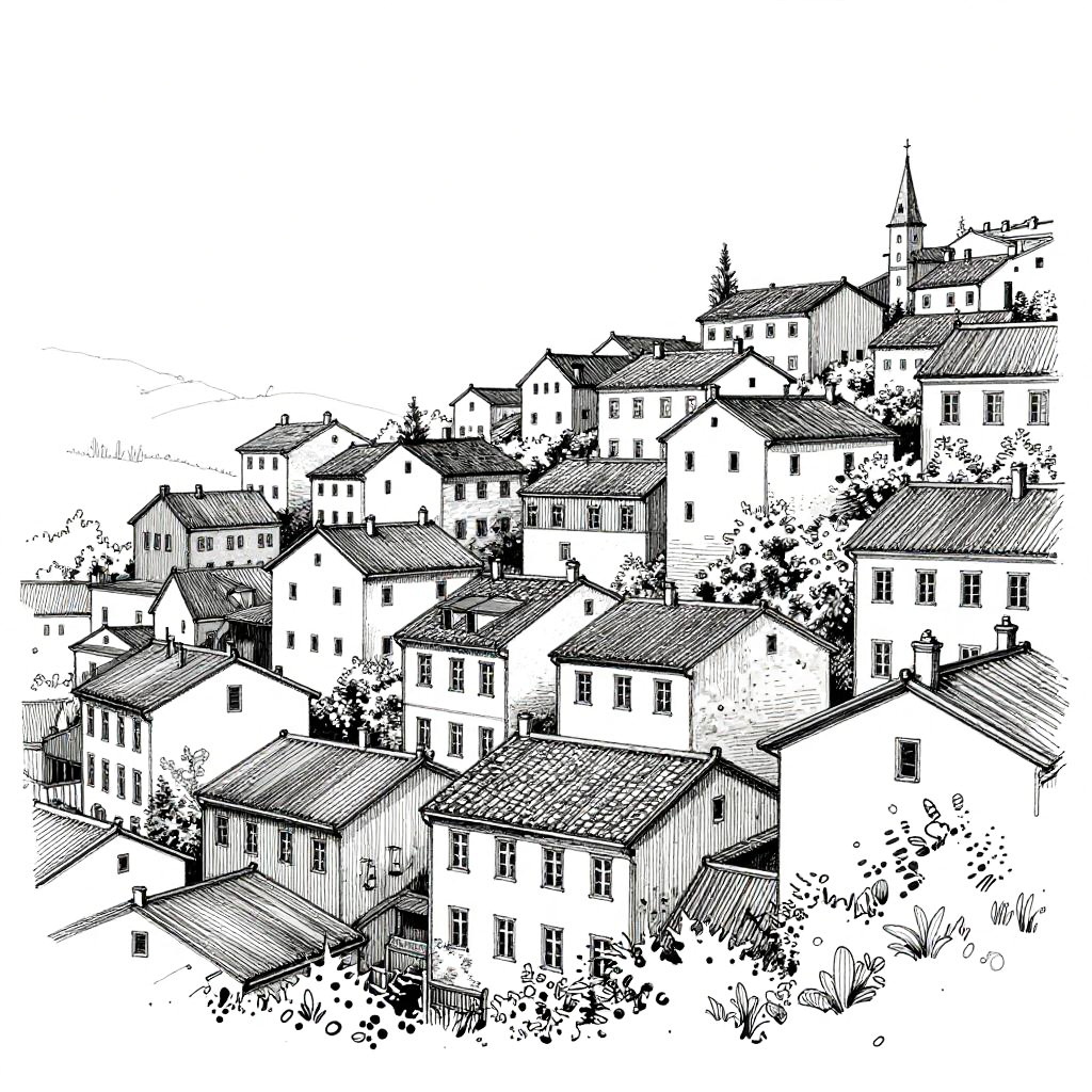 A monochrome sketch of a dense hillside town with multiple buildings, fine line art architectural drawing style, detailed rooftops and windows, black and white color scheme