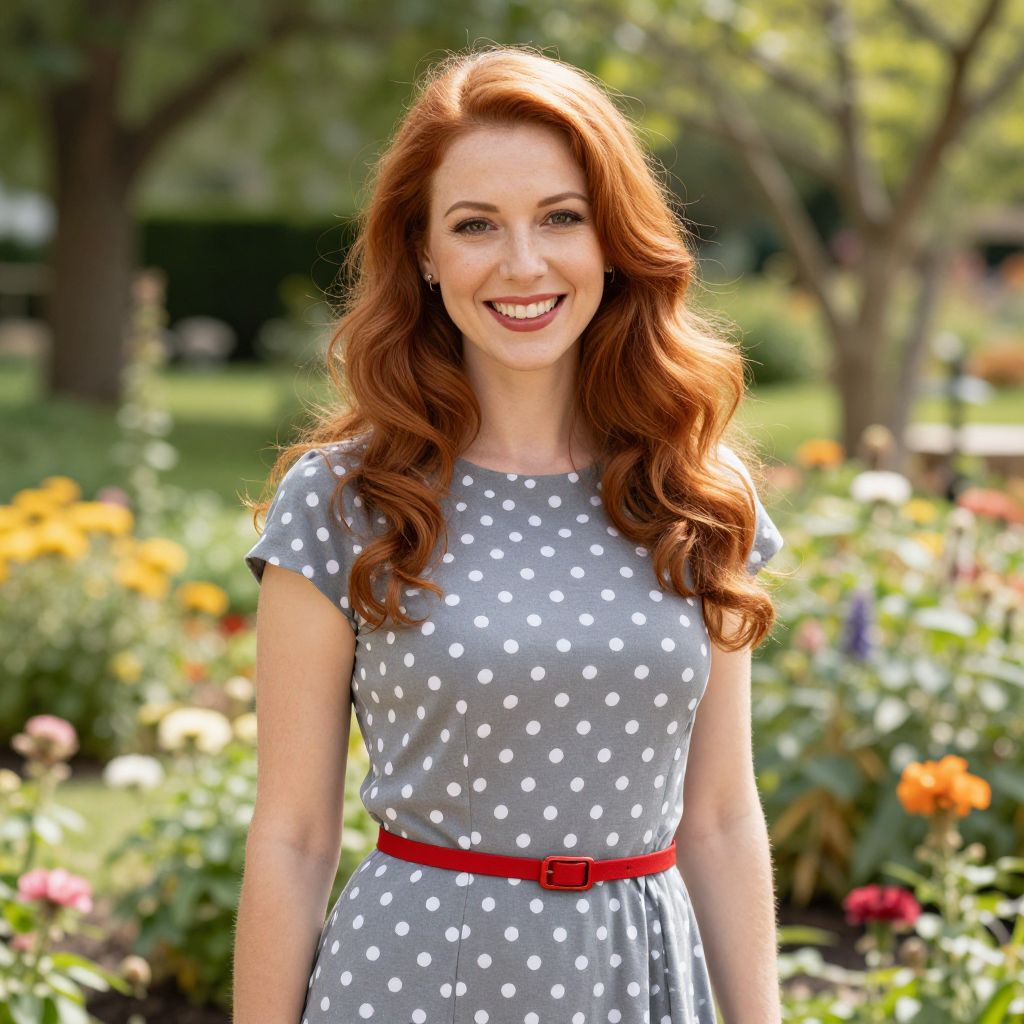 This is a bright, sunny photo of a smiling woman with long, wavy red hair. She's wearing a gray, short-sleeved dress with white polka dots and a red belt. The background is a lush, colorful garden with blurred flowers and trees, giving a warm, cheerful vibe. Her light skin and red hair contrast nicely with her outfit and the greenery around her.
