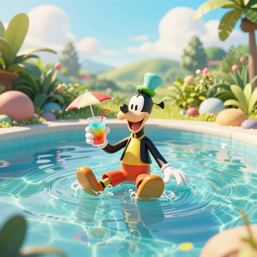 Digital illustration of Disney's Goofy floating in a pink, sprinkled donut-shaped inflatable pool ring in a sunlit swimming pool. Goofy, wearing a green hat and orange shirt, smiles with one hand on the ring and the other outstretched. The clear blue water reflects the bright sunlight, creating sparkling highlights. The background includes a blurred, sunlit pool deck with some greenery. The overall mood is playful and cheerful, with vibrant colors and a cartoonish style.