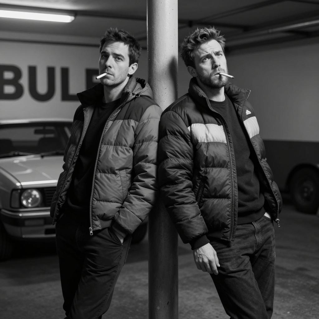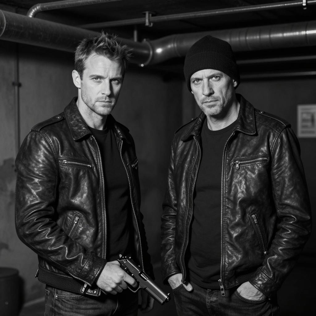 Black-and-white photograph. Two men in a dimly lit basement. Man on left, holding gun, wears leather jacket, sharp gaze. Man on right, wears beanie, leather jacket, hands in pockets, intense expression. Background includes pipes and darkened room.