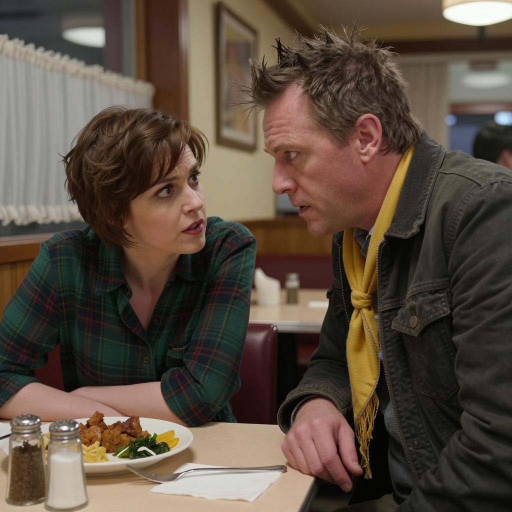 Nighttime scene. Three people. Woman with dark, curly hair, floral dress, mouth open wide, hand on man's chest. Man with glasses, green and white plaid shirt, red undershirt, tan pants, mouth open. Person with messy blonde hair, back to camera, leather jacket. Green grass, white fence, twisted tree branches in background.