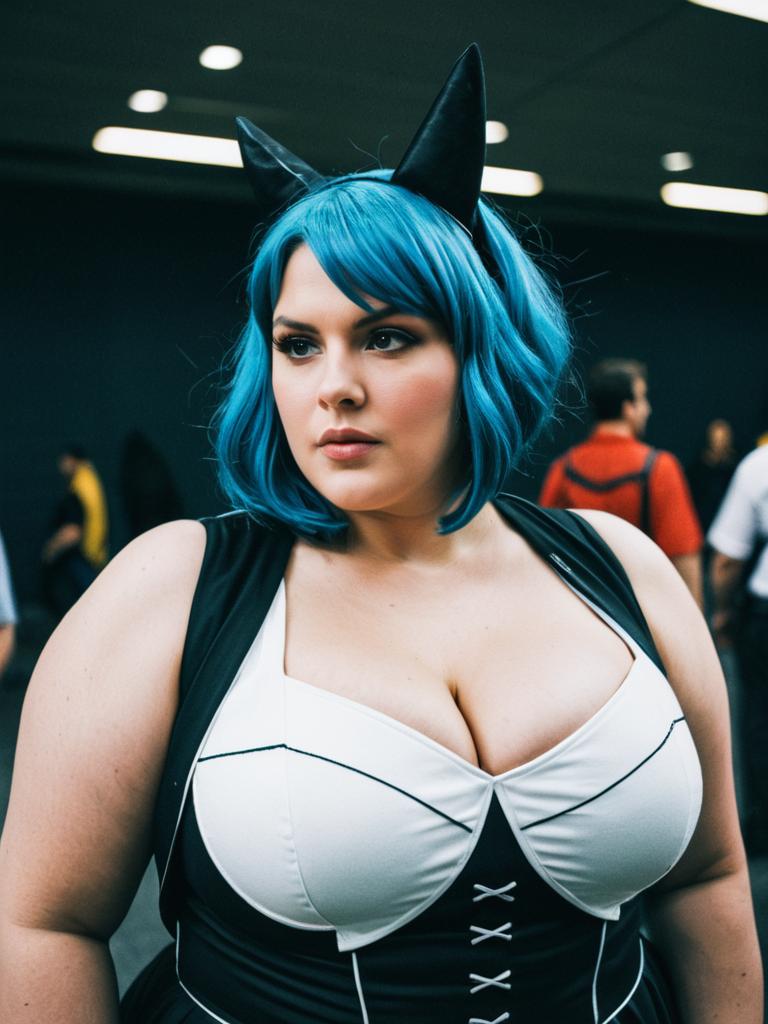 Woman in Plus Size costume, cosplay editorial portrait, cinematic realism
