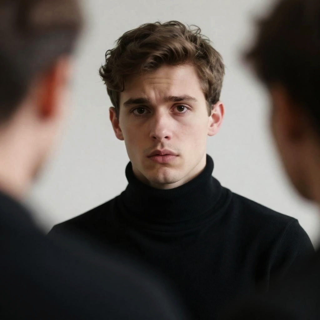 Photograph of a young white man with short brown hair, wearing a black turtleneck, looking intensely at someone out of frame. Background is blurred. Man's face shows concern. Out-of-focus dark shape in foreground. Bright light highlights man's face.