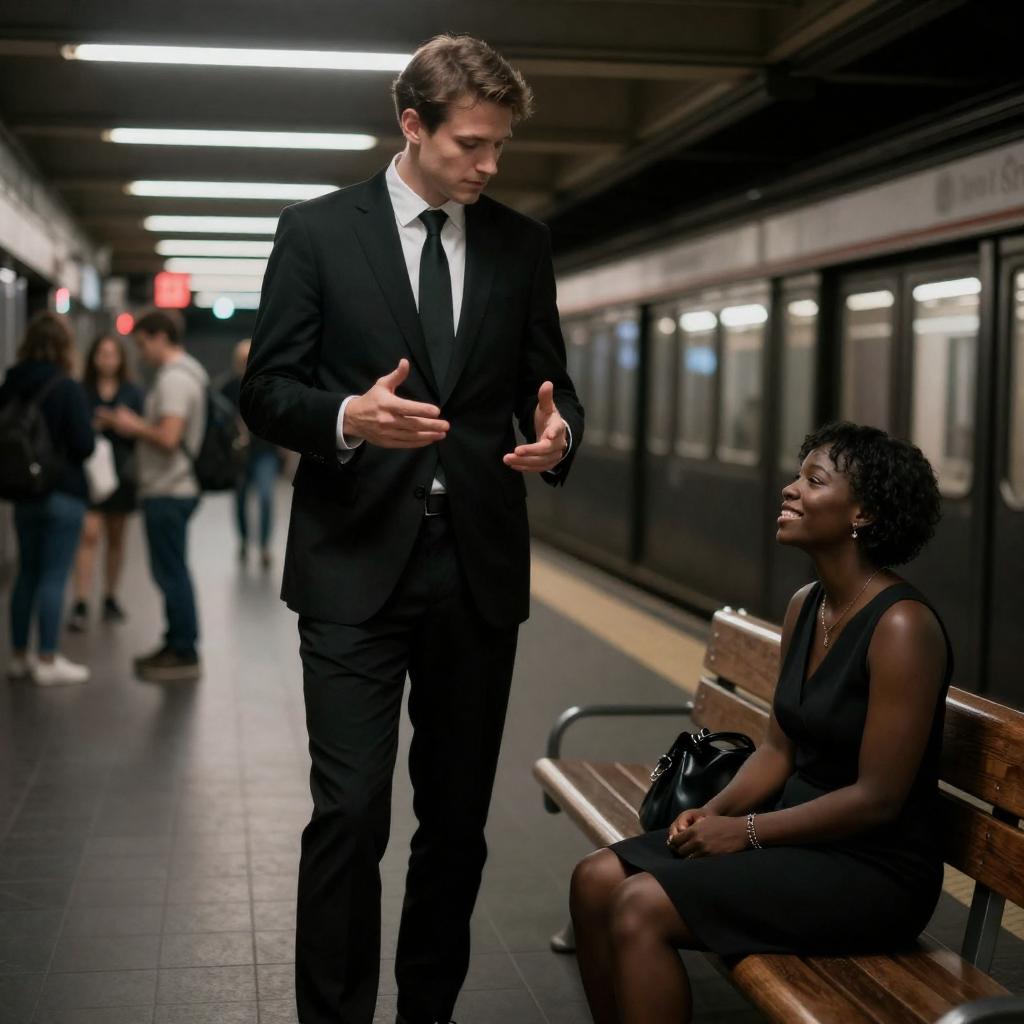 A young businessman with medium brown hair and light skin, dressed in a gray suit and white shirt, is sitting on a bus seat holding a black leather briefcase. He looks intently upward at a standing man in a dark suit who is holding a newspaper. The interior of the bus features metal-framed windows.
