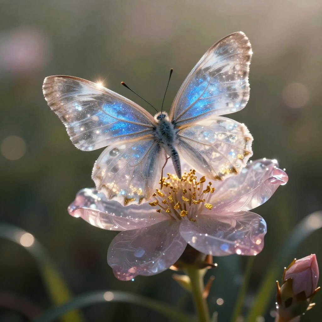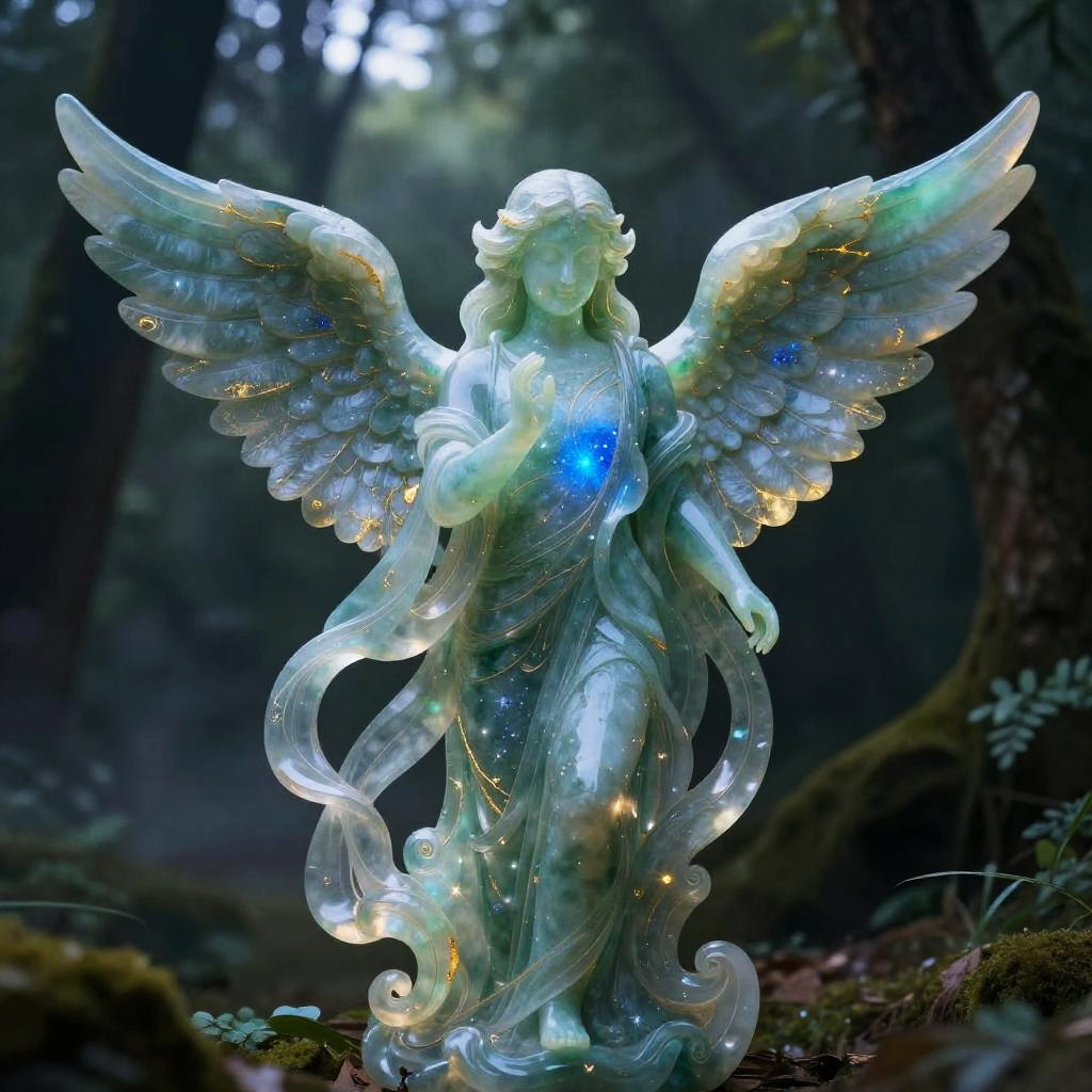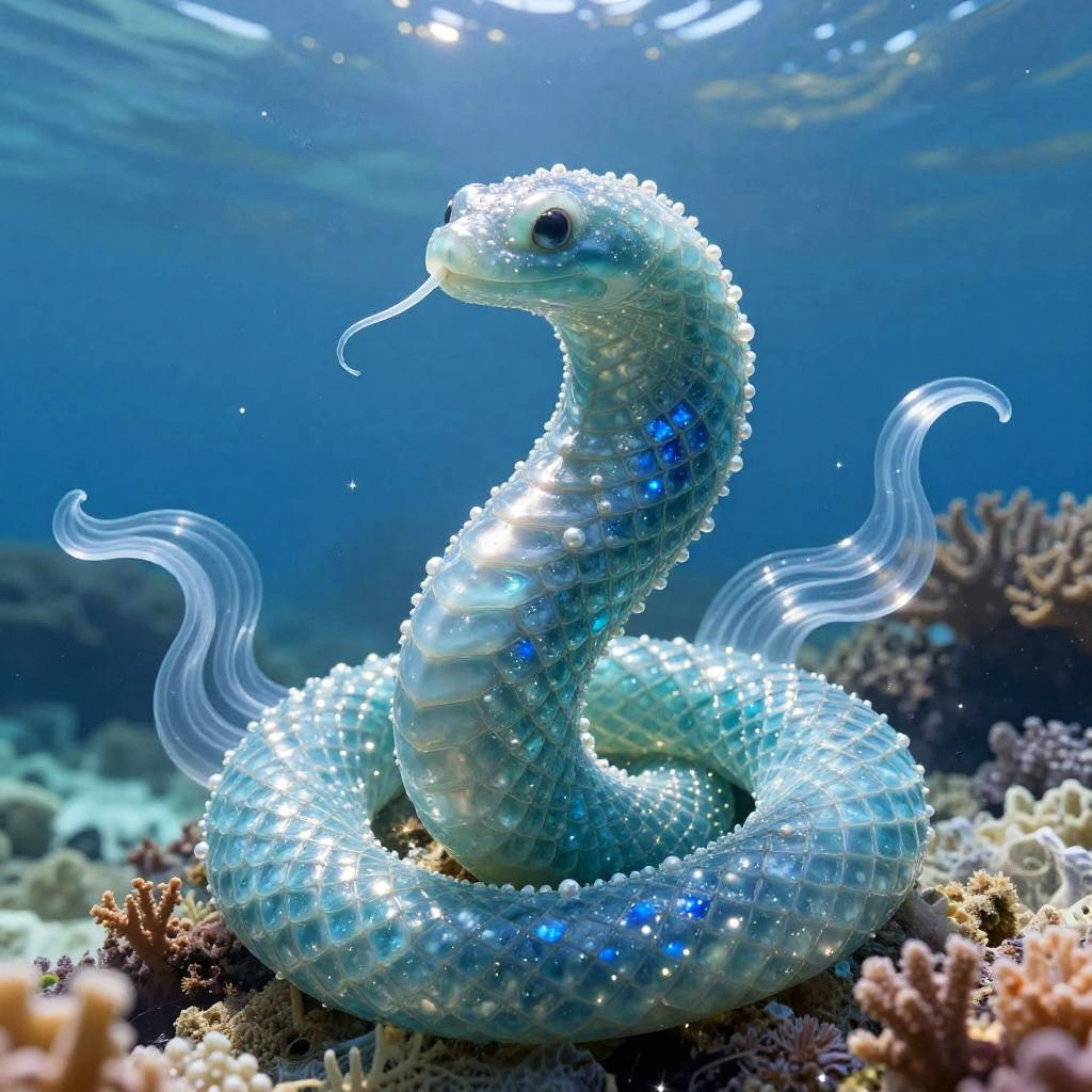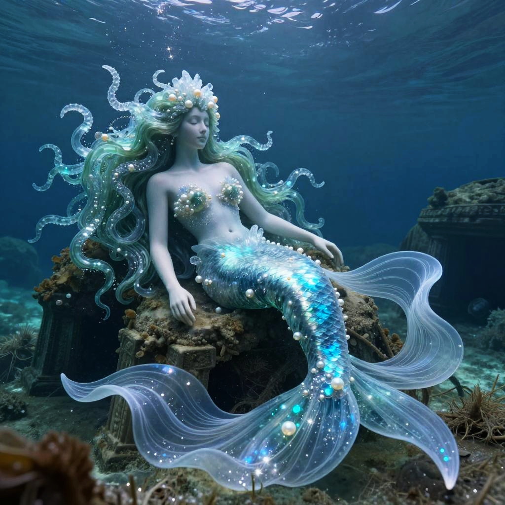 Artwork of tranquil mermaid reclining with flowing seaweed hair shaped from crystalline aquamarine with embedded iridescent pearls, placed in sunken ancient ruins beneath gently rippling ocean surface. Translucent wraps swirl like wind-sculpted dunes around the form, radiant blue core, starry sparkles across the surface. Deep shadows amplify the glow; volumetric haze, soft rim light, subtle bokeh, mystical and otherworldly, fine-art composition, high detail.