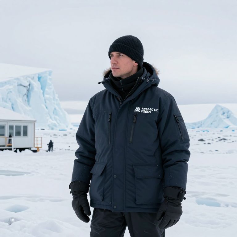 A professional journalist in a thick polar parka and waterproof gloves standing on a snow-covered research station in Antarctica, wearing a branded news outlet jacket with 'ANTARCTIC PRESS' printed on it, looking toward the horizon with a serious expression, captured in high-resolution outdoor photography with cold, stark lighting and a backdrop of ice cliffs and frozen tundra.