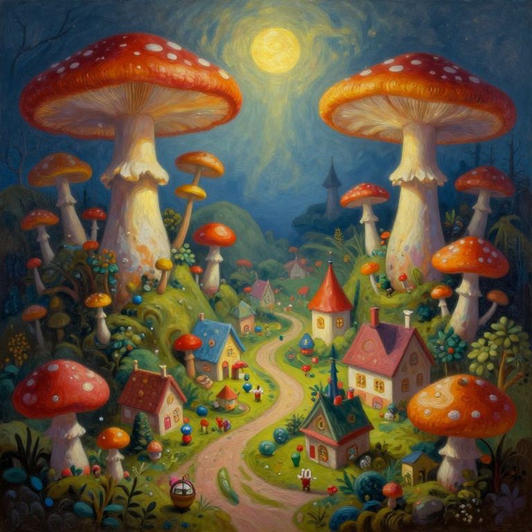 Whimsical digital painting of a fairy-tale village under a full moon, surrounded by towering red-spotted mushrooms, colorful houses, and a winding