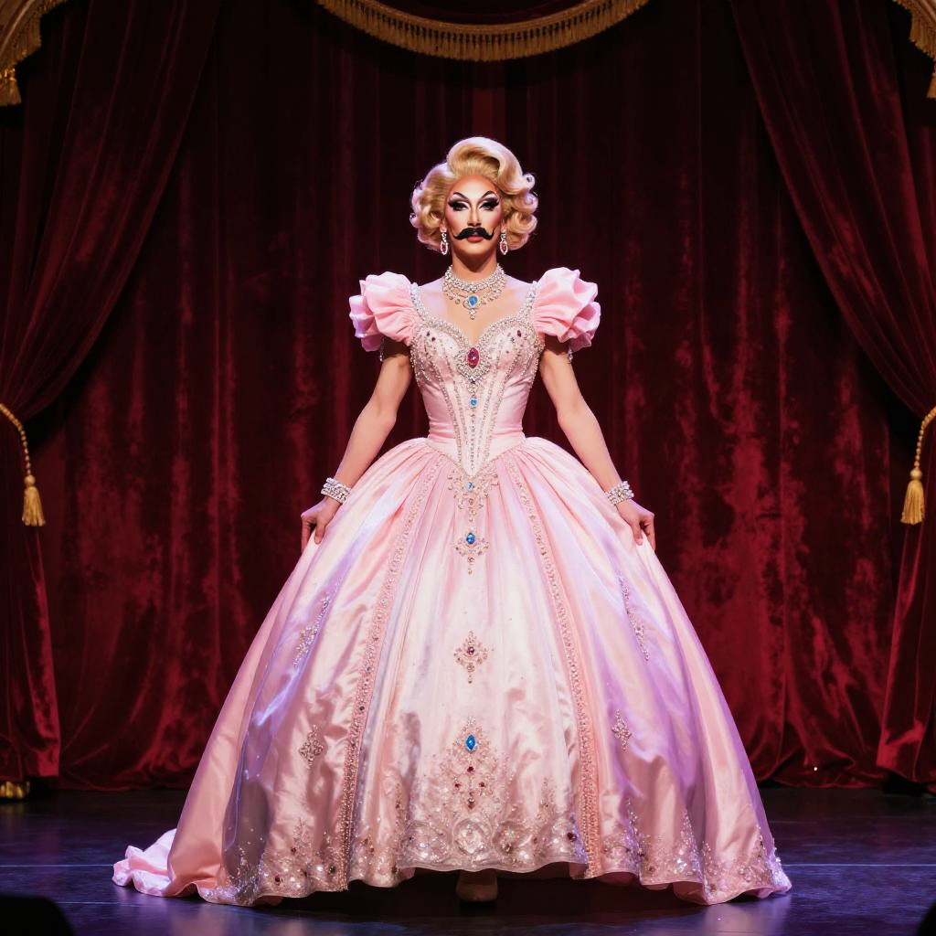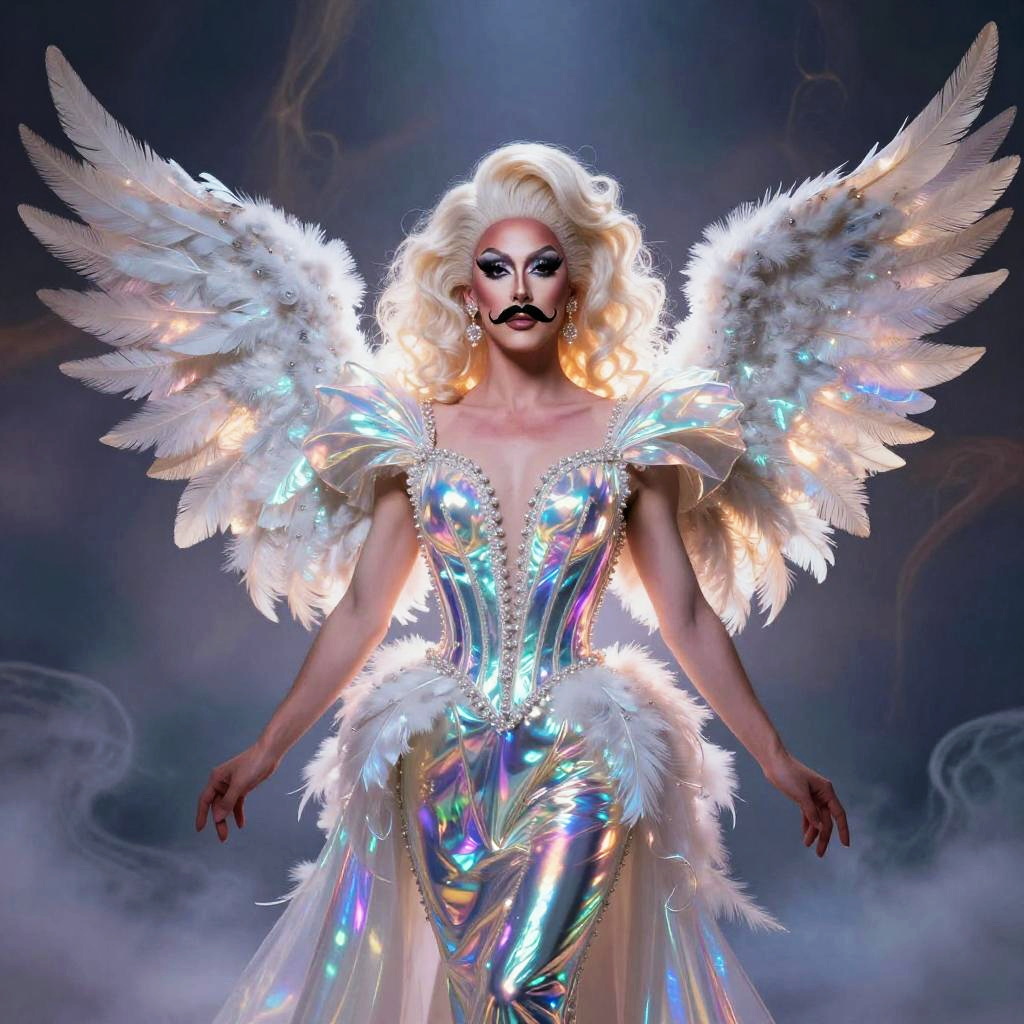 Drag queen with mustache, surreal fantasy setting, iridescent costume, dramatic wings made of feathers and light, mystical aura, ethereal dreamy background