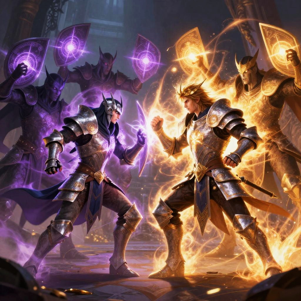 Epic confrontation between a kalashtar paladin and shadowy enemies, radiant psychic shields deflecting dark magic, glowing runes illuminating the scene, detailed armor with spiritual motifs, swirling energy and dynamic light effects, vivid fantasy art composition.