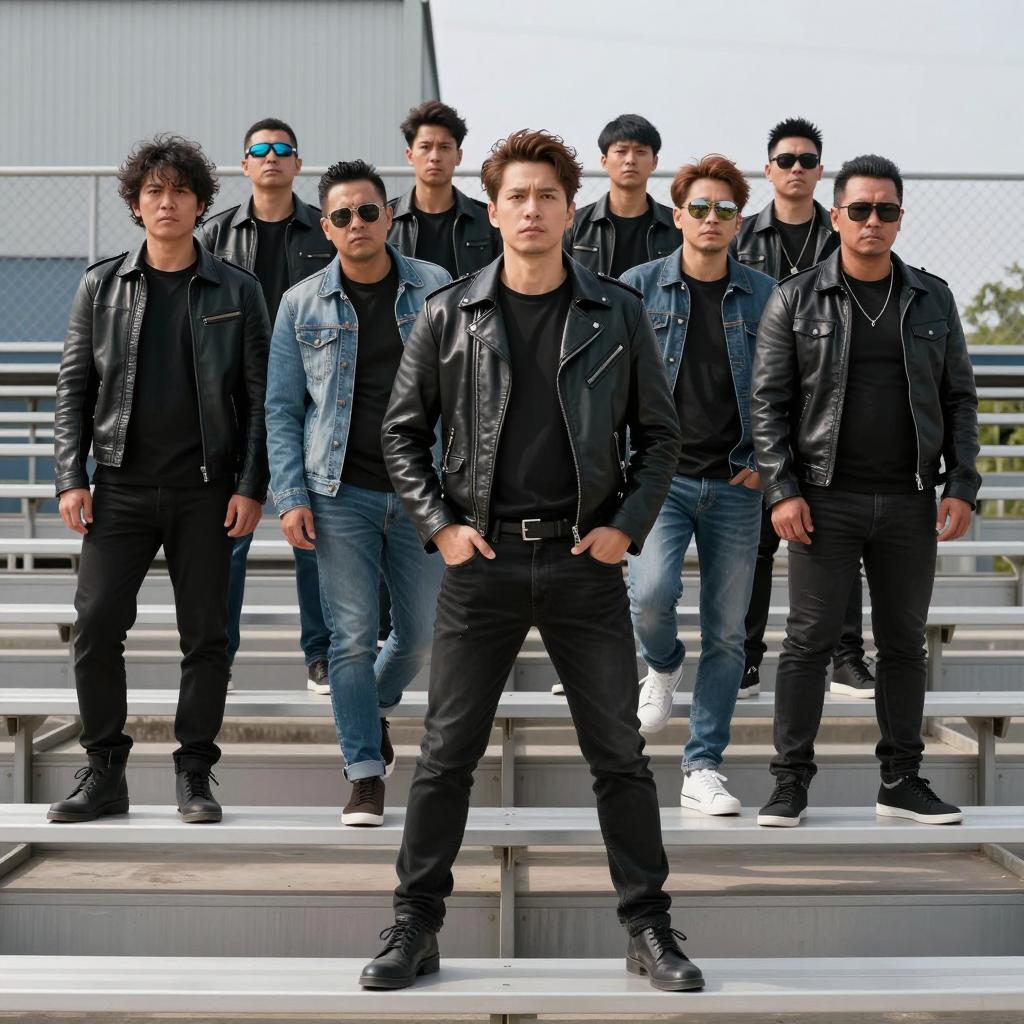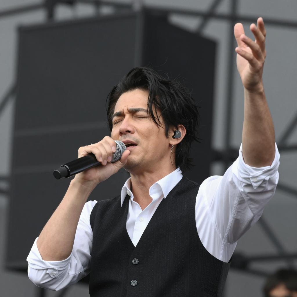 Photograph of a male singer with dark hair and a metallic silver jacket, standing at a microphone, playing an electric guitar. He has an intense expression, mouth open mid-song. Background includes a drummer in a white suit and another musician partially visible. Dim lighting, focused on the singer. Drum set and microphone stand visible.