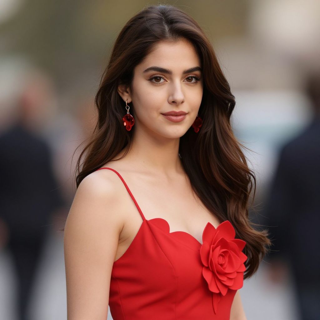 Photograph of a young woman with long, wavy dark brown hair and olive skin, wearing a vibrant red, sleeveless dress adorned with a large rose on the left side. She has dark, arched eyebrows, subtle makeup, and wears red, teardrop-shaped earrings. The background is blurred, featuring indistinct people and a light, outdoor setting. She stands confidently, looking slightly to her right with a gentle smile. The image has a sharp focus on her face and dress, with a shallow depth of field.