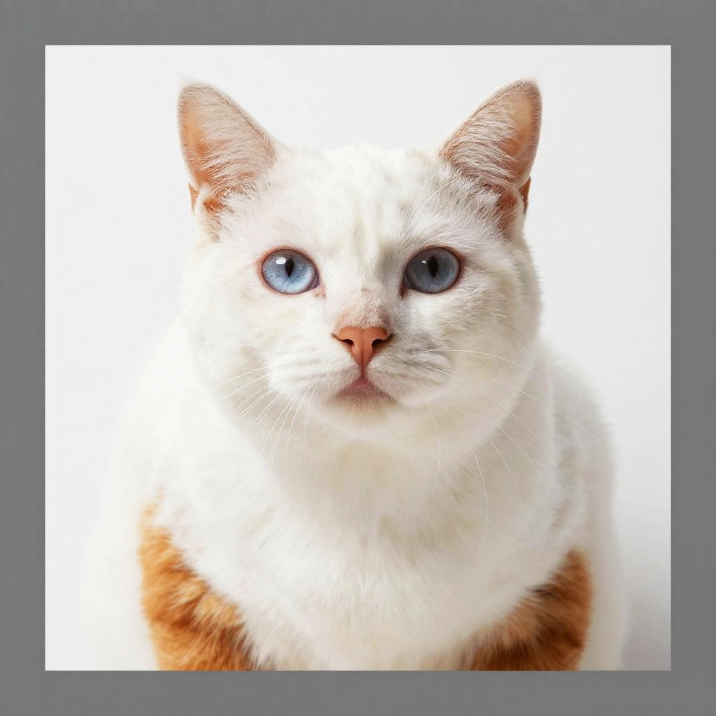 This is a digital photograph of a fluffy white cat with orange legs, captured from a low, upward angle. The cat's face is centered, with its nose and whiskers in sharp focus. Its ears are pointed, and it has a curious expression. The background is a plain white, making the cat the focal point, while the orange legs frame its body. The image has a gray border on the top and bottom.