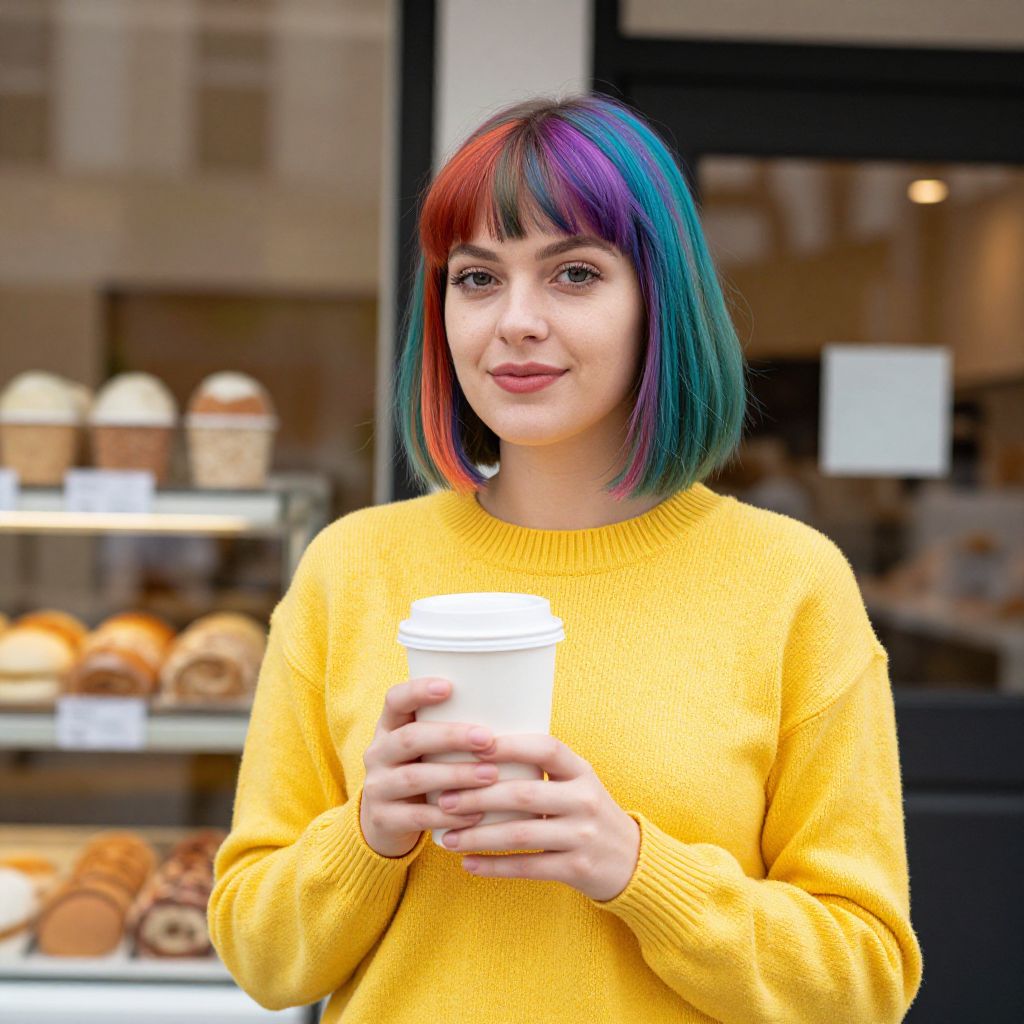 A woman with multicolored hair and a yellow sweater holding a cup of coffee outside sweetart bakery