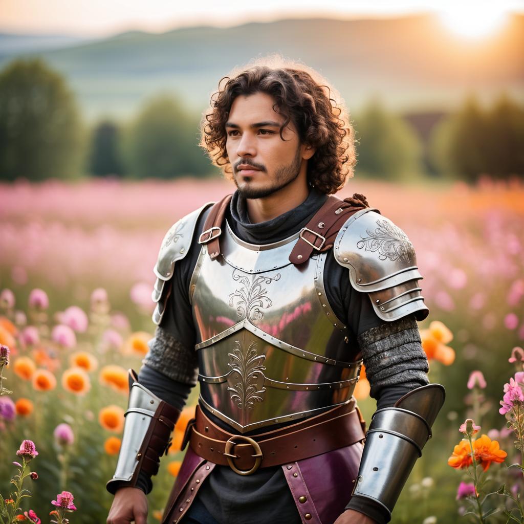 Portrait of a young man with curly dark hair and a short beard wearing detailed medieval-style leather and metal armor. He stands in a vibrant field of blooming wildflowers under warm sunlight, featuring pink, orange, and white flowers with a softly blurred natural background.