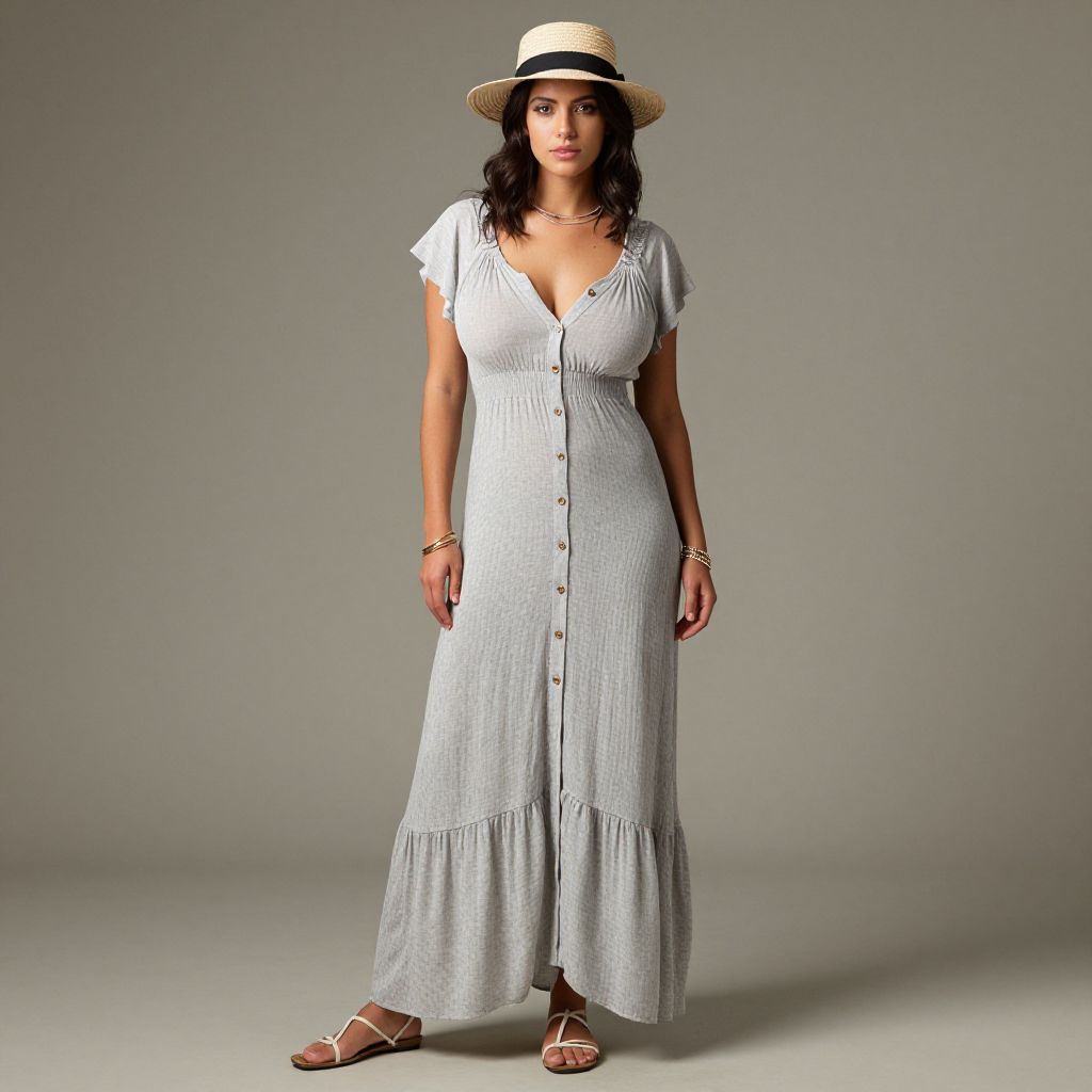 "Woman, bohemian style, light gray maxi dress with short flutter sleeves, button-up front, ruffle hemline, straw boater hat with ribbon, layered bracelets, simple silver necklace, flat strappy sandals, neutral studio background. Sexy. Pretty face and beаutiful eyes. Big breasts."