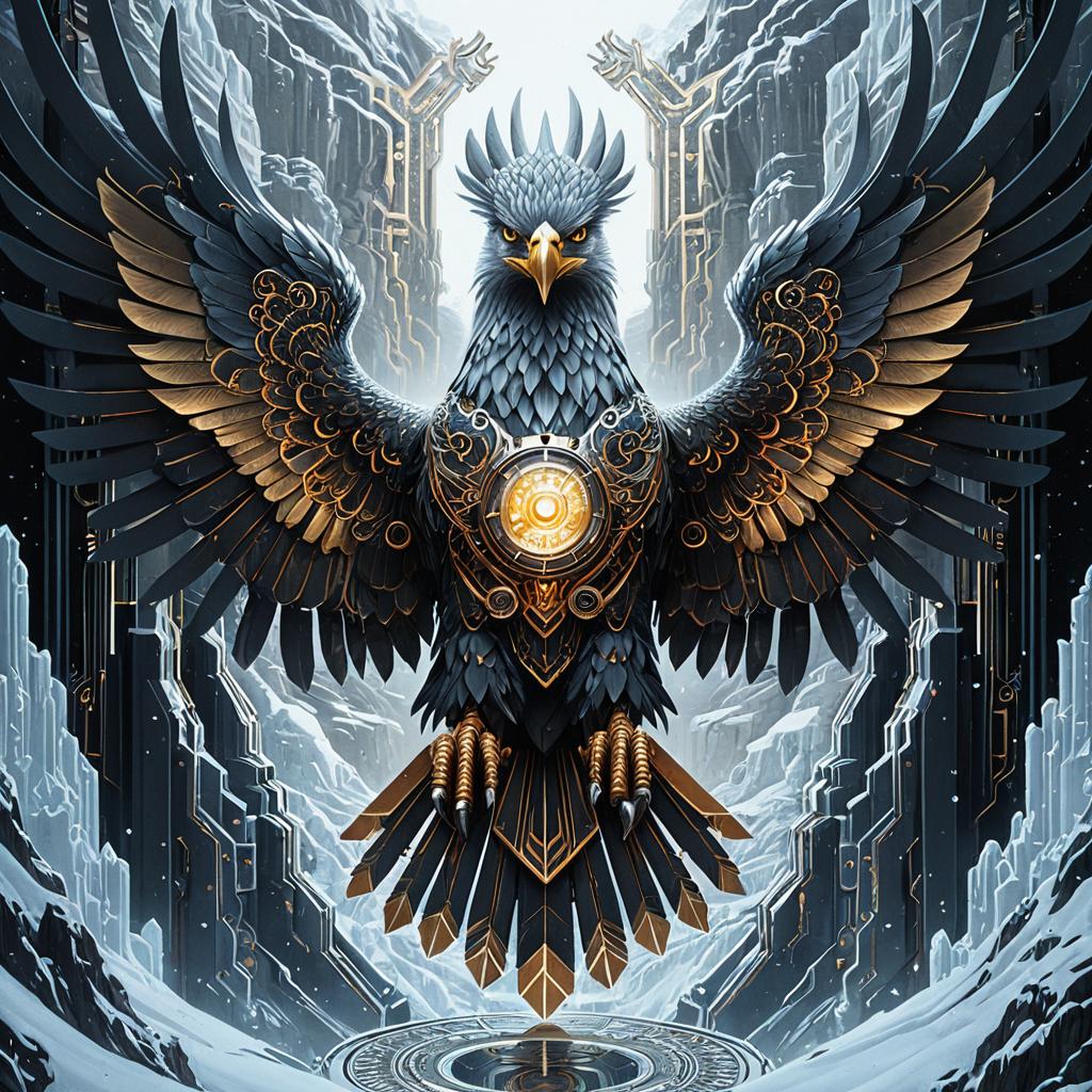 Digital painting of a mechanical eagle phoenix with outstretched wings, featuring intricate metallic filigree and glowing circuitry. The eagle is set against a frosted crystal canyon backdrop with a high level of detail and symmetrical composition, showcasing sharp focus and smooth textures. The artwork combines futuristic and fantasy elements in an 8K resolution concept art style.